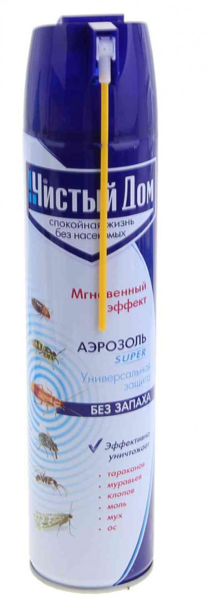 Эффективное и экономичное средство мгновенного действия для уничтожения всех видов летающих и ползающих насекомых: мухи, комары, мошки, моль, кожееды, осы, тараканы, постельные клопы, муравьи. Препарат не имеет запаха.