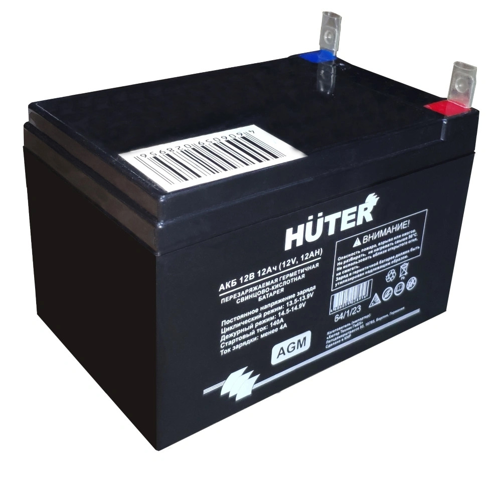 Аккумуляторные батареи свинцово-кислотные, герметичные. Предназначены для запуска бензиновых электрогенераторов, оснащённых электрическим стартером. Могут применяться, так же, и для другой бензиновой техники со схожими техническими параметрами. Аккумуляторы HUTER изготовлены при помощи технологии AGM (Absorbent Glass Mat). Отличие батарей AGM от классических в том, что в них содержится абсорбированный электролит, а не жидкий, что даёт ряд преимуществ в свойствах аккумулятора: