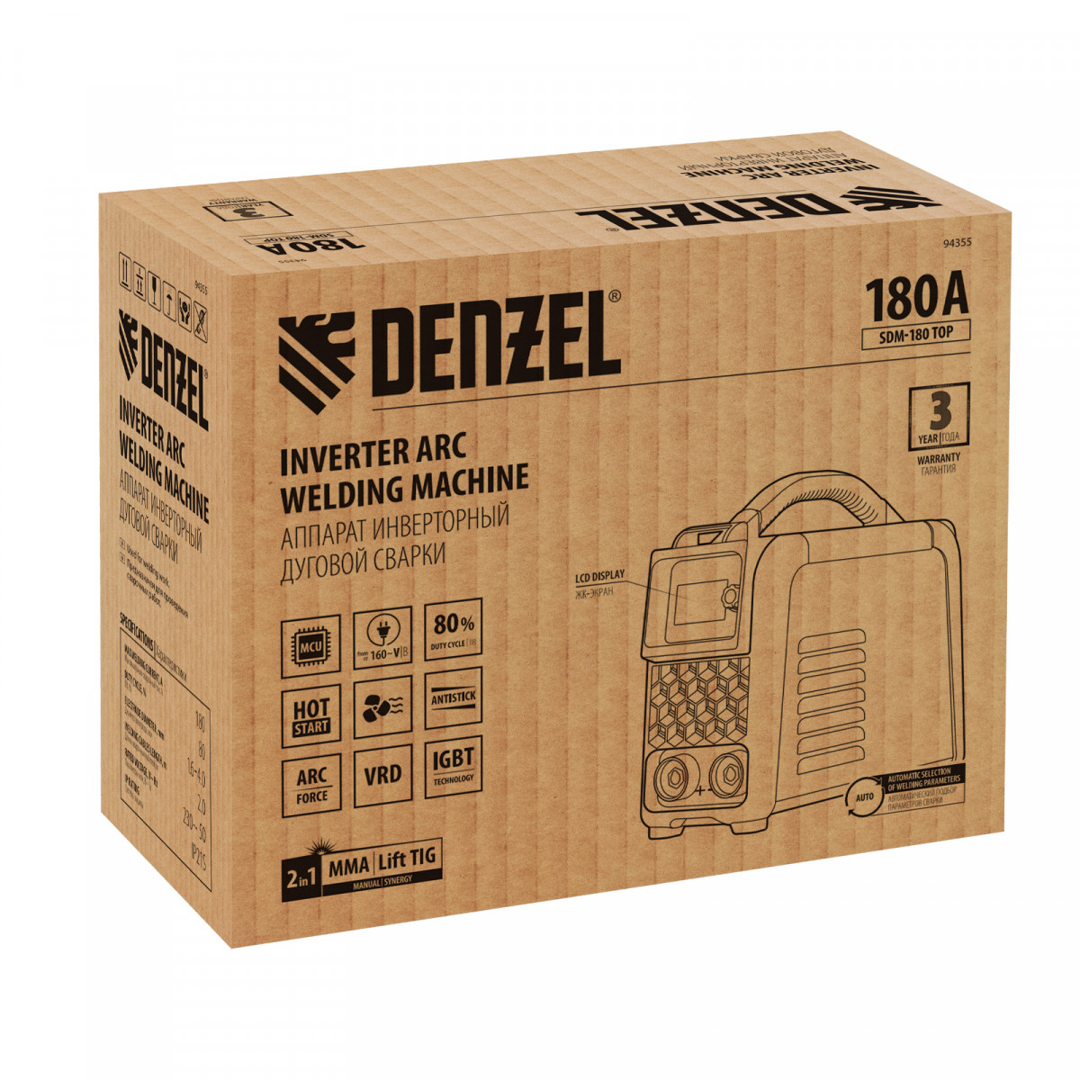 Инверторный аппарат дуговой сварки Denzel SDM-180 Top 94355 характеризуется увеличенной продолжительностью включения 80% и работает со сварочным током до 180 А. Предназначен для сварки штучными электродами диаметром до 4 мм изделий из низкоуглеродистых сталей в режиме MMA, а также аргонодуговой сварки неплавящимся электродом TIG LIFT (горелка приобретается отдельно). Аппарат эффективно работает даже при нестабильном напряжении. Устройство предназначено для использования в быту и профессиональной сфере.,Основное достоинство линейки Denzel SDM — синергетическое управление, значительно облегчающее подбор оптимальных параметров сварки. Аппарат дает возможность указать толщину свариваемого металла, после чего автоматически подбирает оптимальный сварочный ток и диаметр электрода. И наоборот: достаточно установить требуемое значение сварочного тока и на дисплее отобразится минимальная рекомендованная толщина свариваемых деталей, а также диаметр электрода. Аппарат эффективно работает даже при нестабильном напряжении, предназначен для использования в профессиональной сфере и в быту.