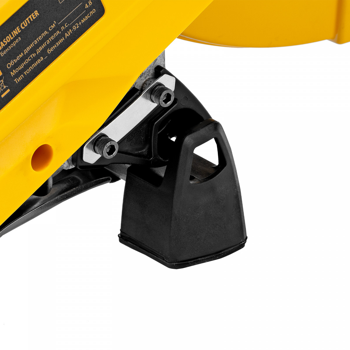 - Безопасность — режущий диск закрыт защитным кожухом, блокиратор курка газа исключает случайный запуск двигателя.