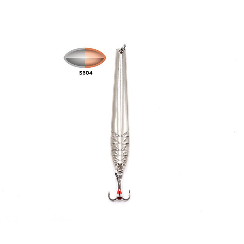 У блесны узкая вытянутая пластина, в лицевой части чуть изогнутая. Такая форма обуславливает соблазнительную выразительную игру: приманка красиво покачивается и отклоняется в сторону от вертикали на подбросах различной интенсивности. Блестящая поверхность пластины при попадании света заманчиво бликует. Спереди в нижней части есть фигурное рифление.