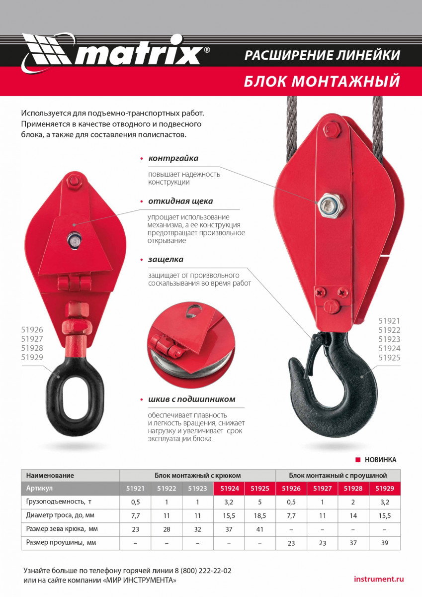 Монтажный блок Matrix 51923 с крюком, грузоподъемностью 2 т, расширяет функциональные возможности ручного и электрического грузоподъемного оборудования. Позволяет менять направление движения груза, а также увеличивает подъемную силу.