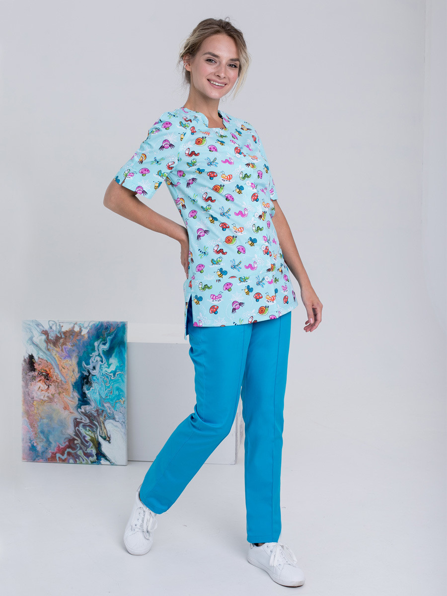 Блуза выполнена из 100% хлопка. Свободный крой не стесняет движений. Изделие имеет длительный срок эксплуатации, не линяет и не выгорает. Дизайн данной модели создает хорошее настроение вам и вашим пациентам.