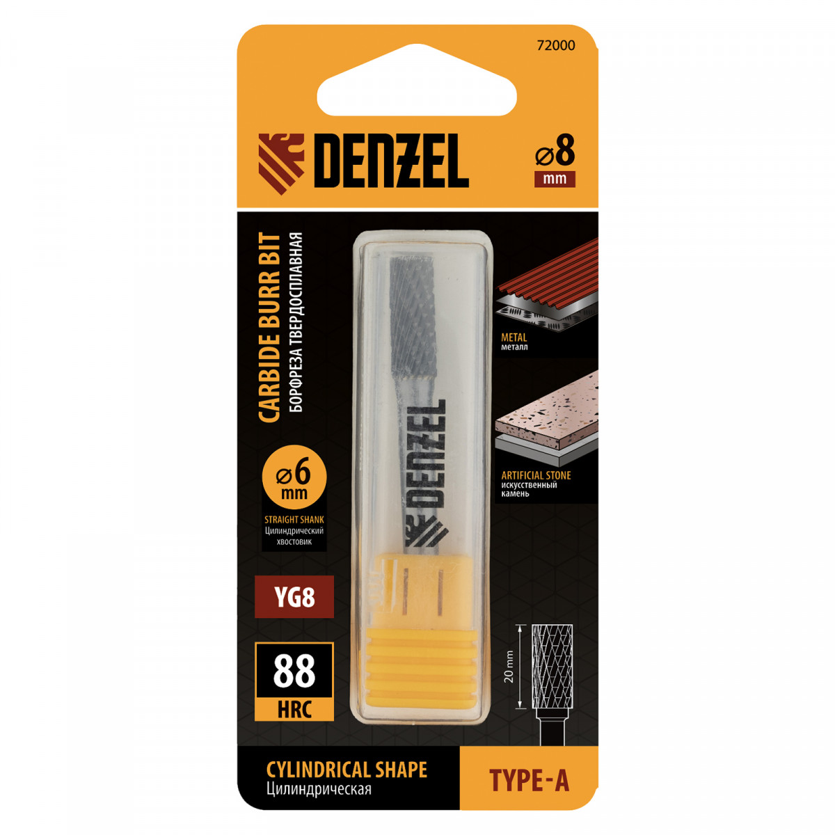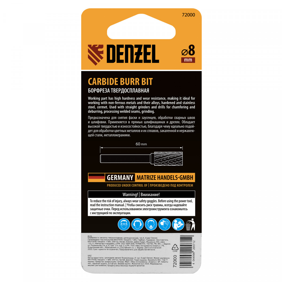 Твердосплавная борфреза Denzel 72000 с цилиндрической рабочей частью (тип A), диаметром 8 мм, используется для работ по металлу (закаленной и нержавеющей стали, латуни, меди, бронзе, чугуну, титану). Подходит также для обработки искусственного камня и металлокерамики. Предназначена для завершающей обработки и подгонки форм и поверхностей: шлифовки, зачистки сварных швов, удаления заусенцев, снятия фасок, разделки кромок. Оснастка устанавливается на прямошлифовальную машину или дрель.