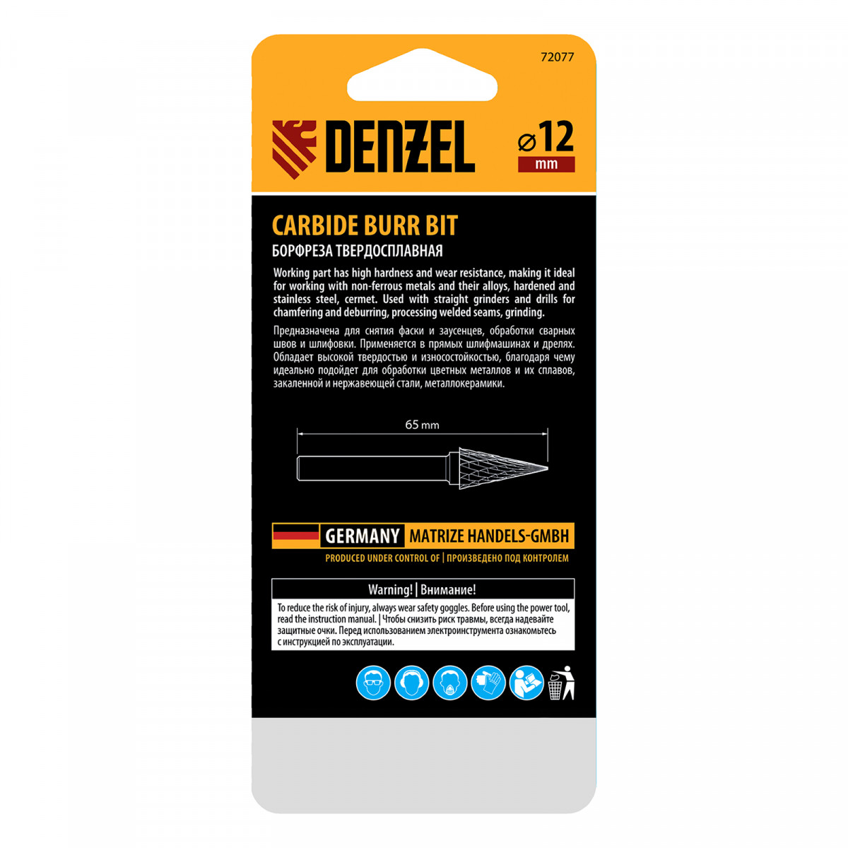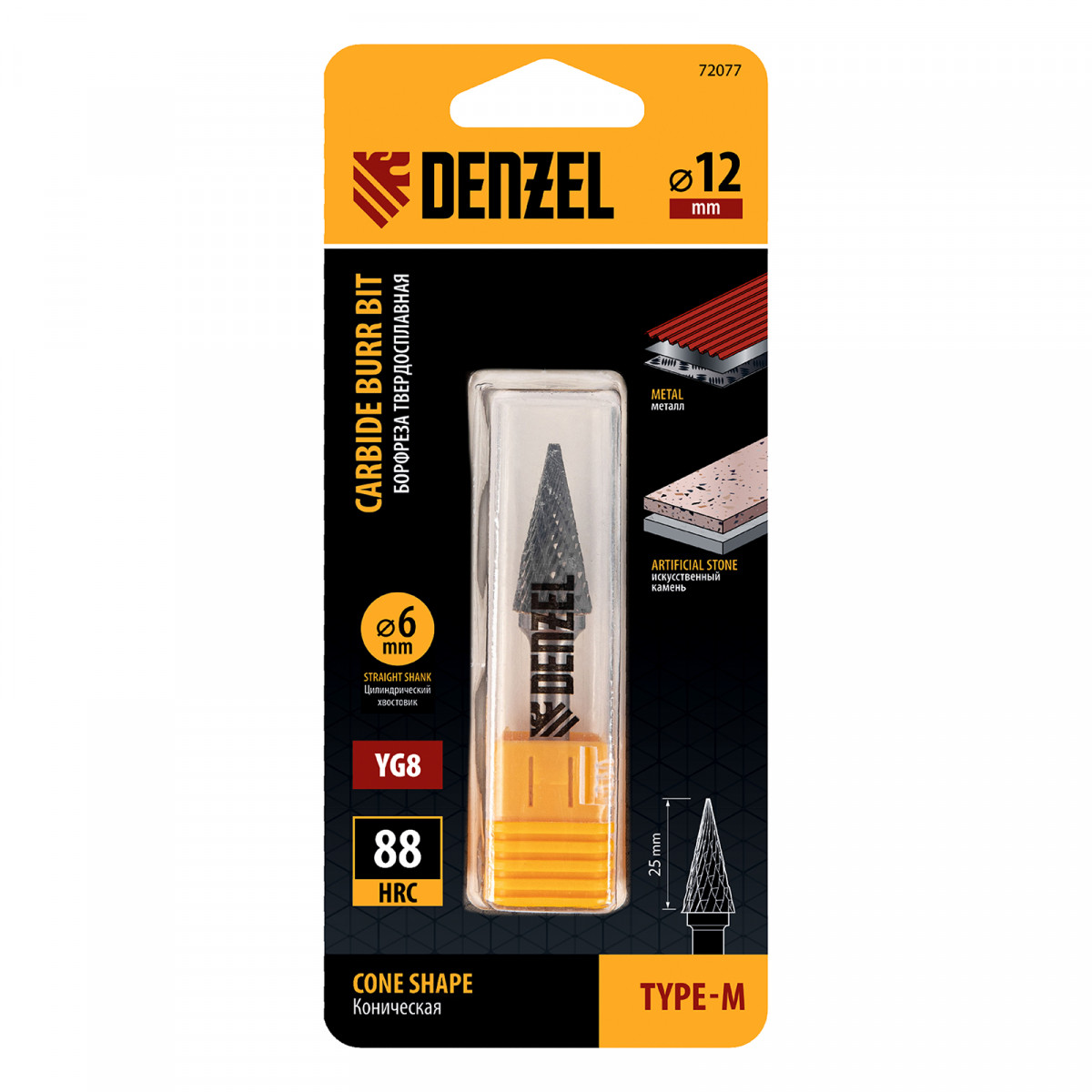 Борфреза по металлу твердосплавная, коническая, тип-M, 12 мм Denzel