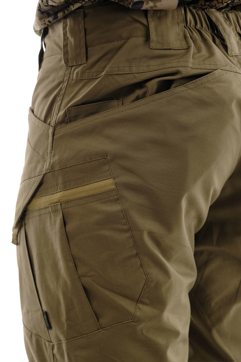 Брюки «Файтер» классического прямого кроя. Застежка на молнию и пуговицу. Пояс по спине собран на резинку, есть шлевки под ремень. Стрелка спереди застрочена. Карманы на бедрах и сзади объемные, застегиваются на листочку с липучкой.