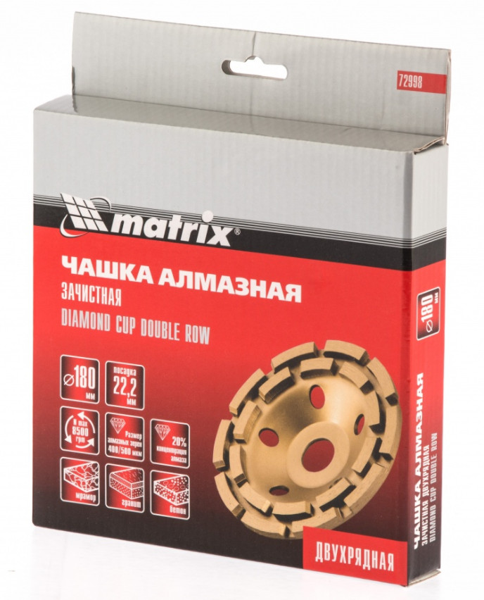 - Чашка алмазная "Двухрядная" ТМ Matrix предназначена для интенсивной грубой зачистки бетона, мрамора, камня, кирпича, гранита.