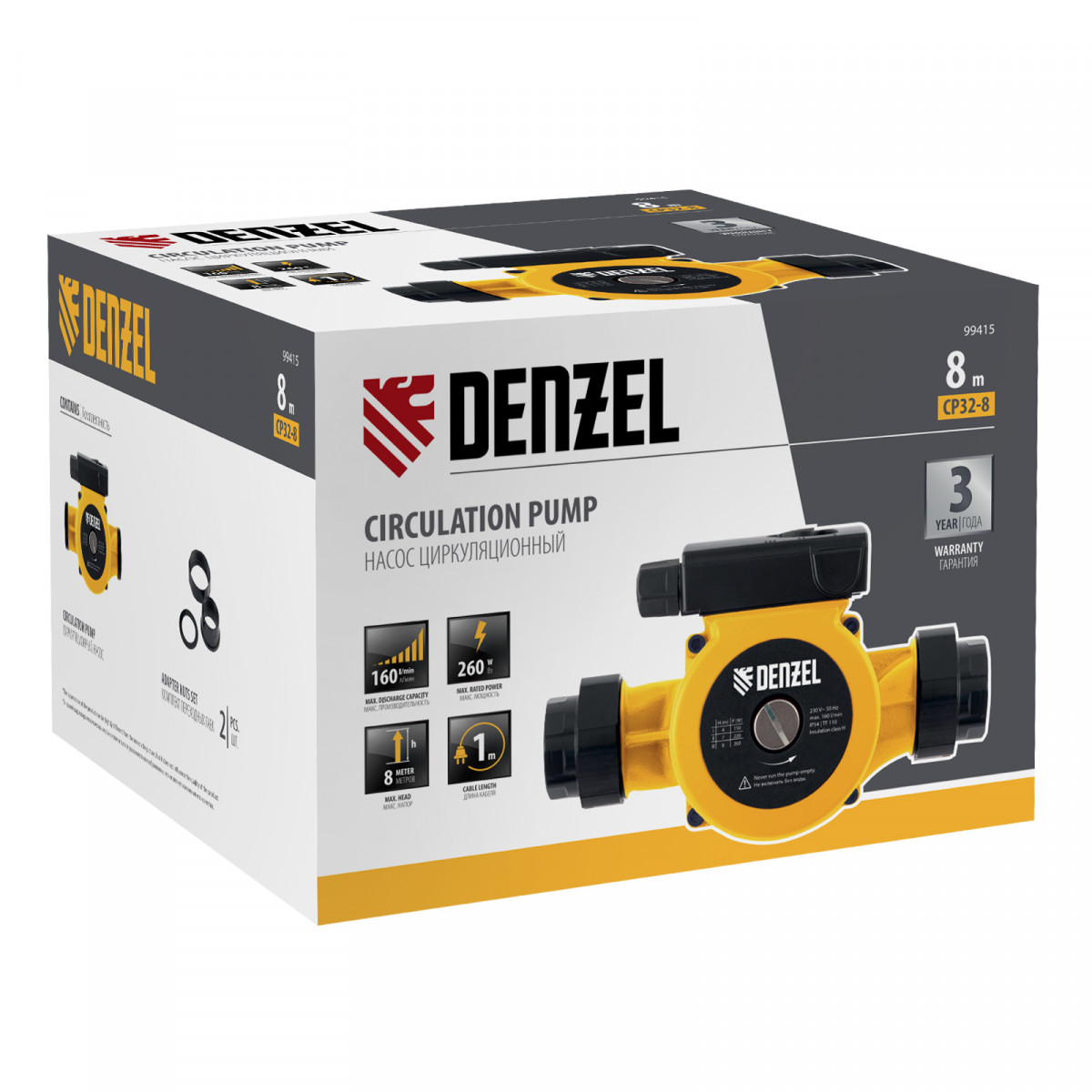 Циркуляционный насос CP32-8, напор 8 м, 160 л/мин, 1 м кабель, монт. длина 180 мм Denzel