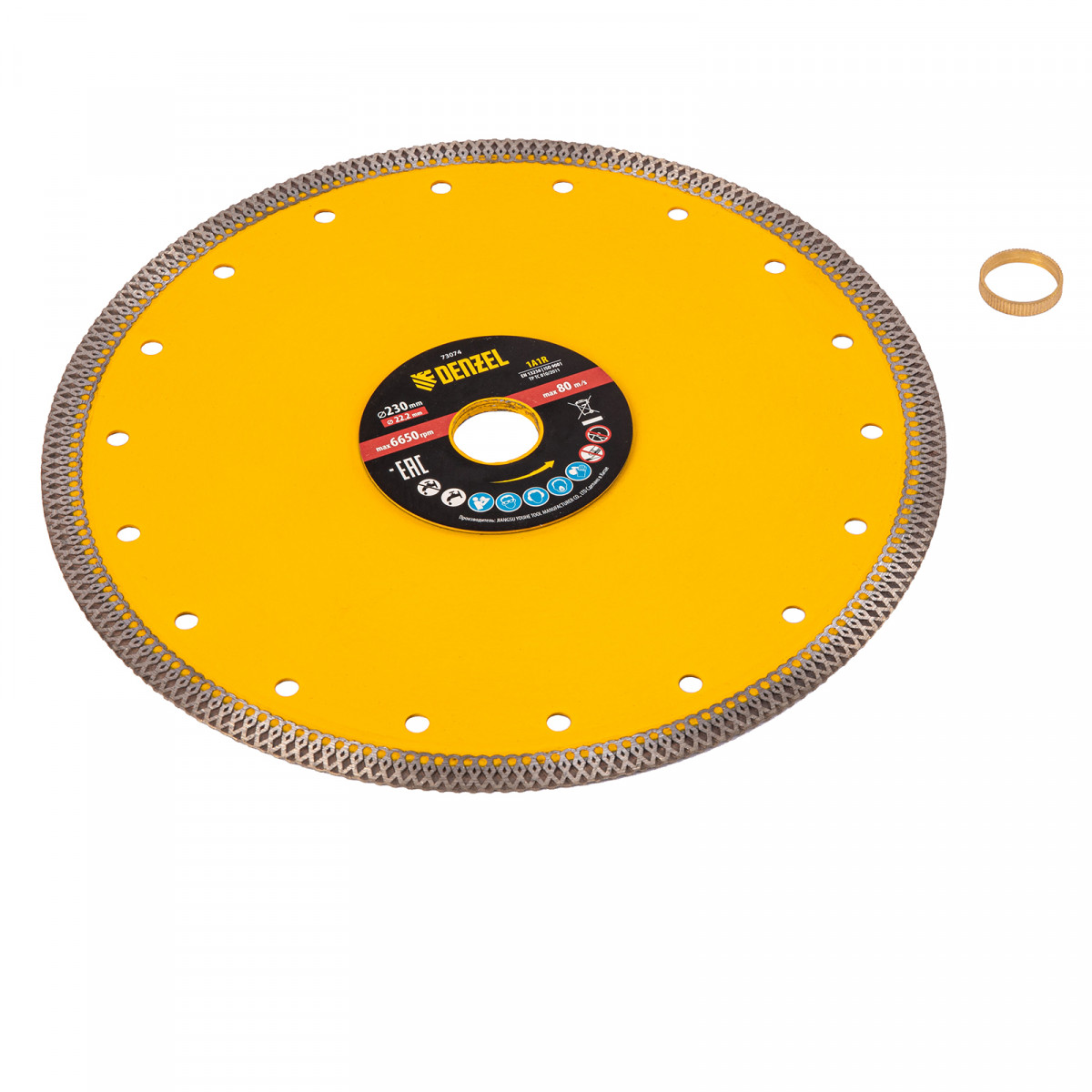 Алмазный диск ТМ Denzel "Сплошной" арт 73074, ф230 х 22,2 мм, предназначен для резания мрамора, керамогранита и керамическую плитки, камня. Устанавливается на УШМ (болгарку) или плиткорез с посадочным диаметром 22,2 мм. Высокая концентрация алмазов и супертонкая рабочая часть диска обеспечивает идеальную частоту кромок и высокую скорость реза.Особая сплошная форма режущей части позволяет использовать диск без водяного охлаждения для кратковременного реза.Диск произведен по технологии горячего прессования с увеличенной шириной режущей кромки (10мм) подходит для профессионального использования и больших объемов работ. При интенсивной резке необходимо использовать водяное охлаждение.