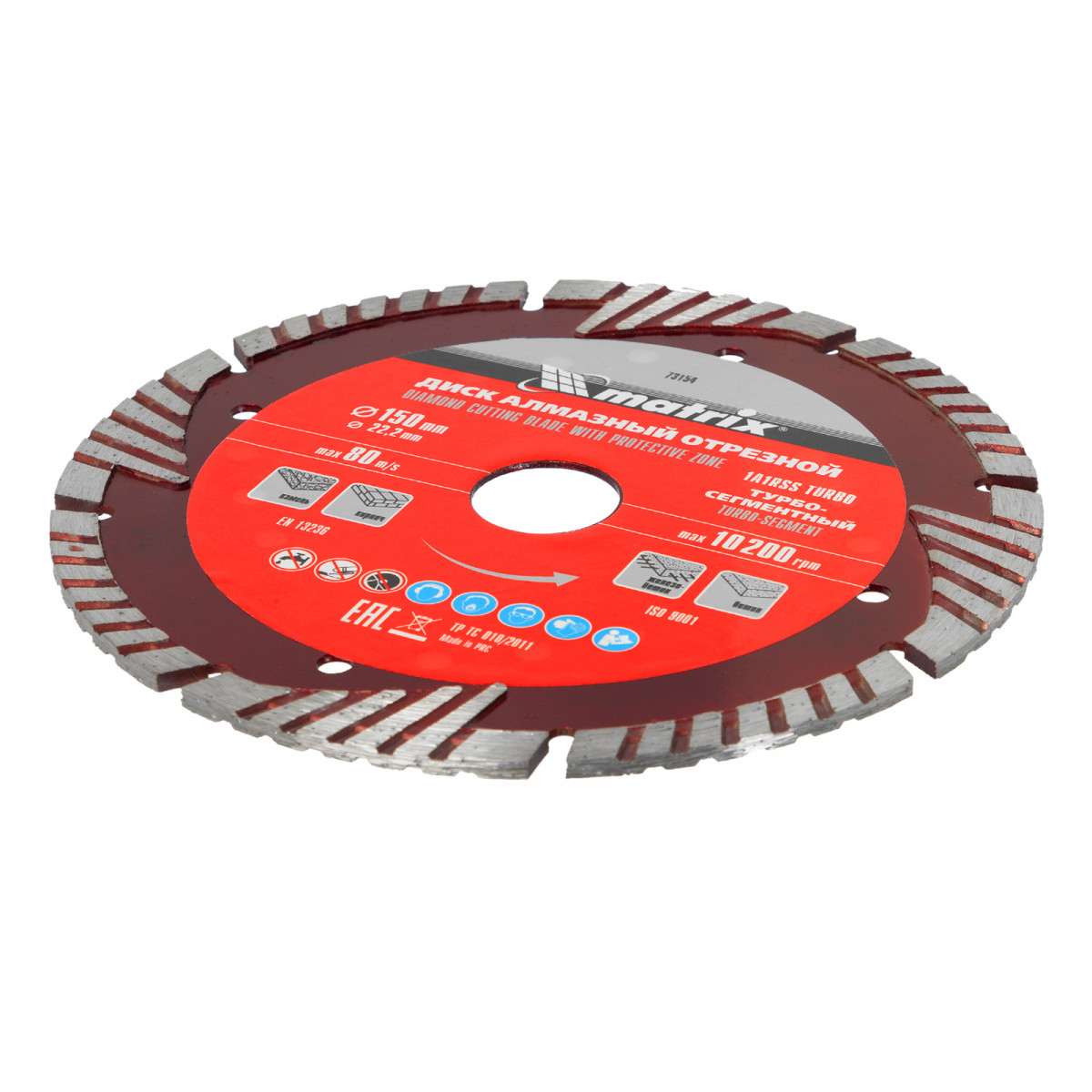 Алмазный отрезной сегментный диск Matrix 73154 с защитными секторами, диаметром 150 х 22,2 мм, применяется для сухой резки бетона разной прочности, камня, кирпича, шлакоблока и тротуарной плитки. Используется как оснастка для углошлифовальных машин с соответствующим посадочным диаметром. Диск изготовлен методом холодного прессования и выдерживает повышенные нагрузки при прохождении арматуры в слабоармированном железобетоне.