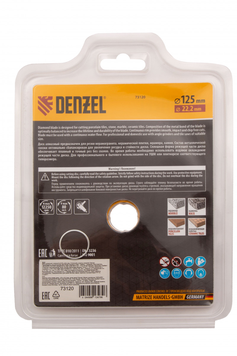 Диск алмазный, отрезной сплошной, 125 х 22.2 мм, мокрая резка Denzel