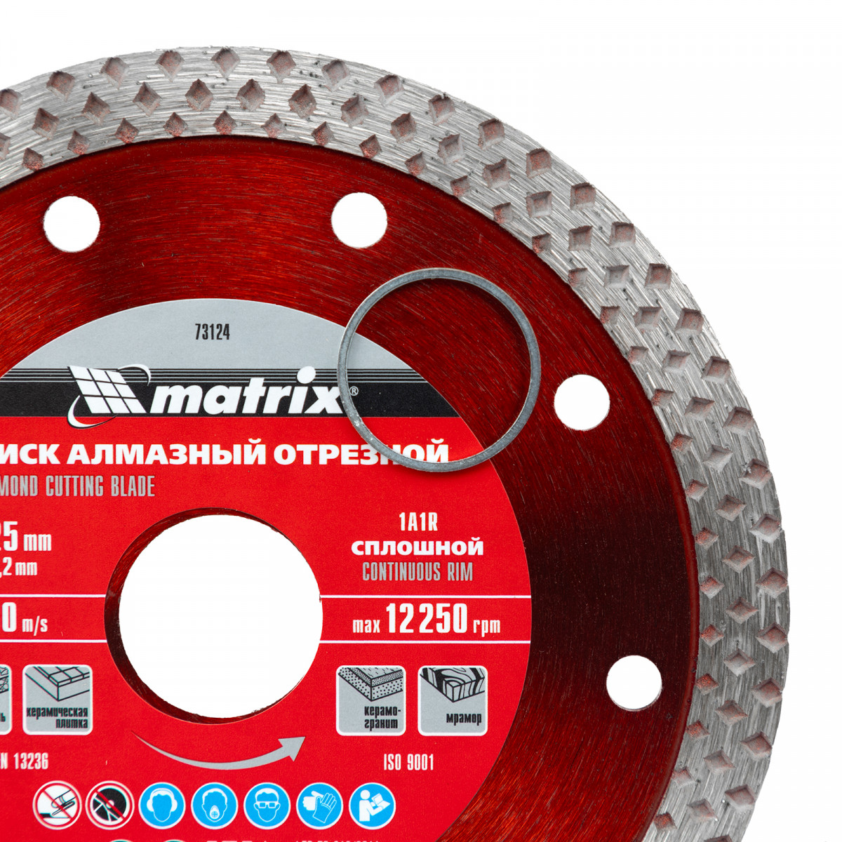 Сплошной отрезной алмазный диск Matrix 73124 диаметром 125 мм — оснастка для болгарок и плиткорезов с диаметром вала 22,2 мм. Применяется для сухого и мокрого резания мрамора, искусственного и натурального камня, керамогранитной и керамической плитки. Использование без подачи воды расширяет возможности инструмента, но для увеличения ресурса диска рекомендуется применять водяное охлаждение. Оснастка предназначена для решения бытовых задач.