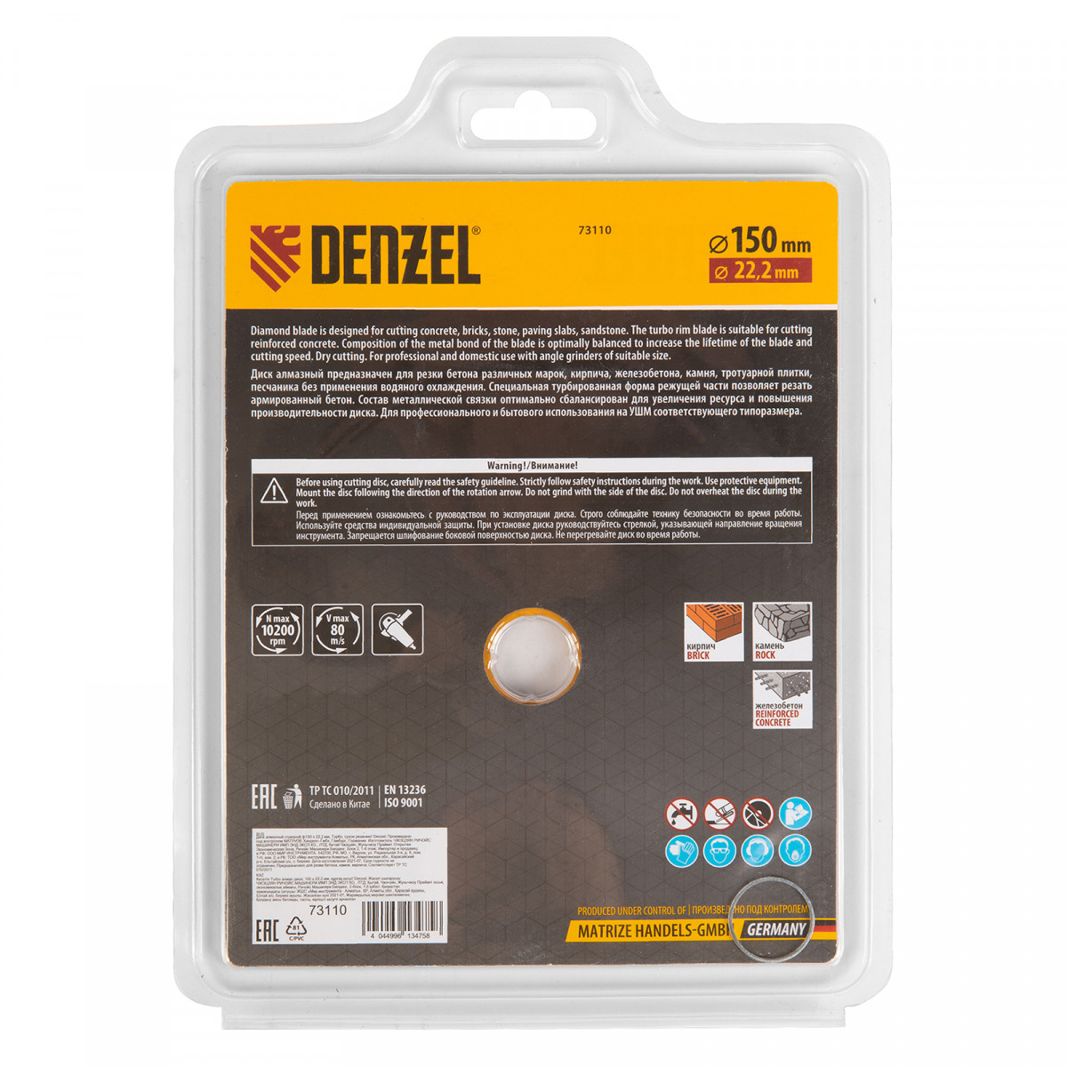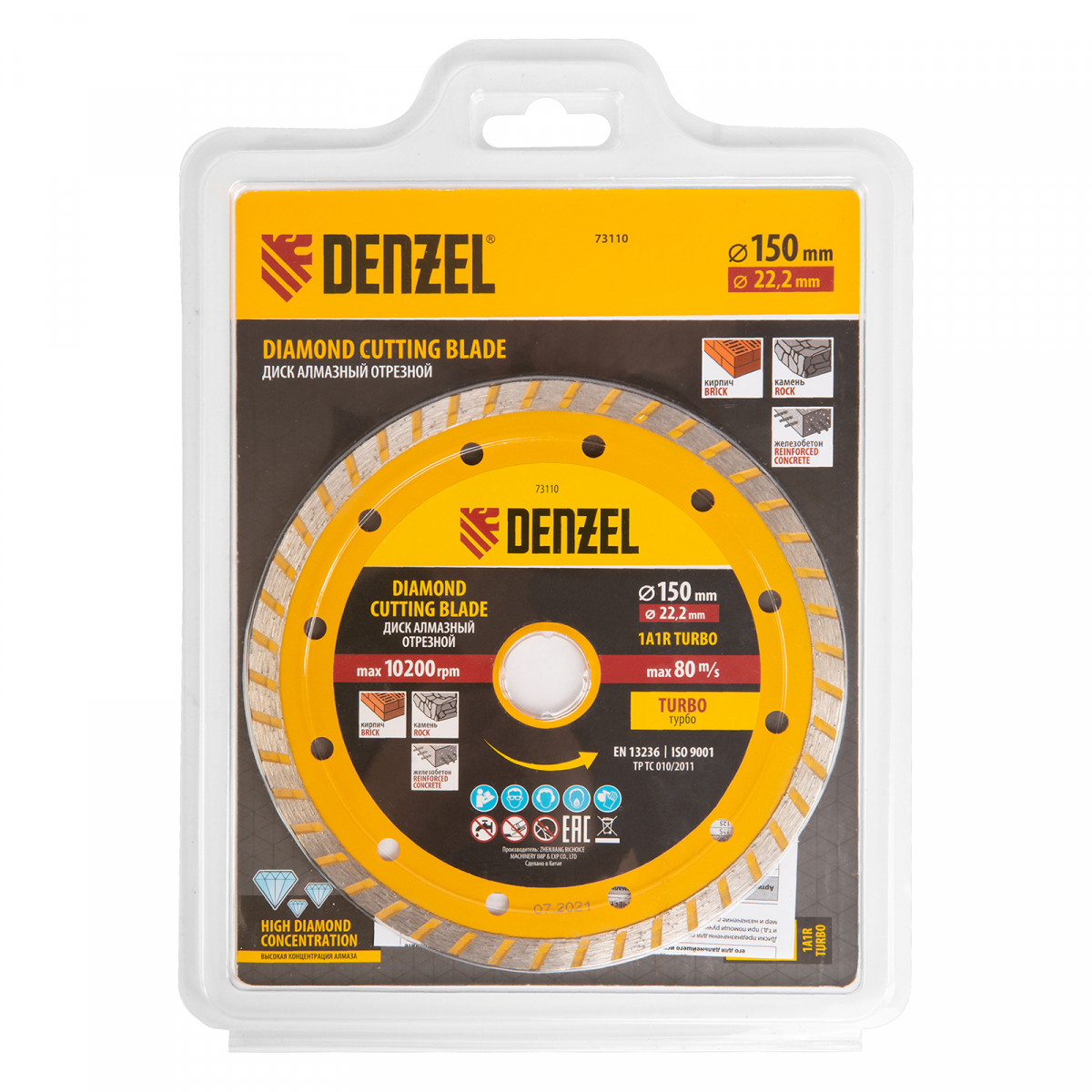 Отрезной алмазный диск Denzel Turbo 73110 диаметром 150 х 22,2 мм используется для сухой резки камня, кирпича, свежего и затвердевшего бетона, железобетона. Благодаря специальной форме испытывает уменьшенную нагрузку при резании материалов. Устанавливается на УШМ и применяется для проведения бытовых и профессиональных отрезных работ.