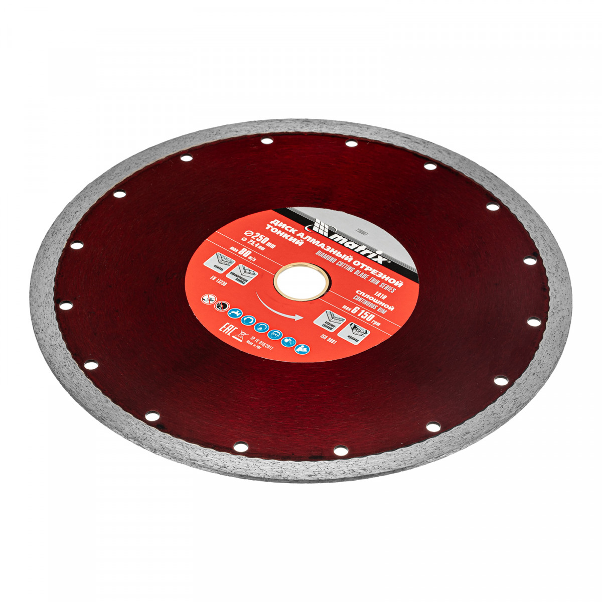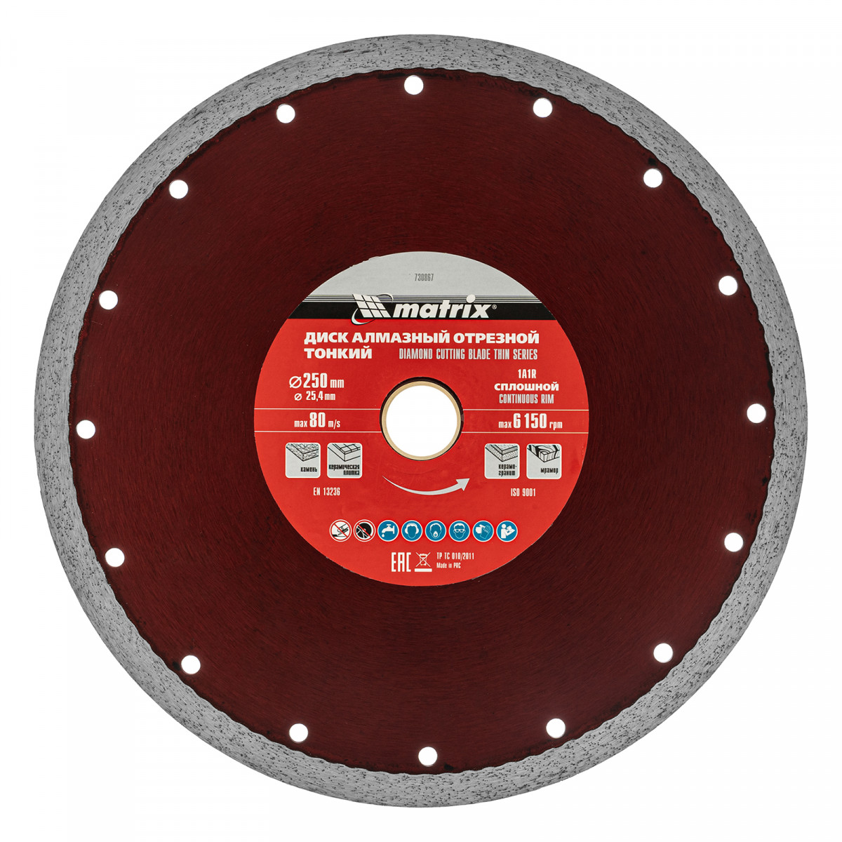 Тонкий сплошной алмазный диск Matrix 730867 диаметром 250 х 25,4 мм предназначен для «мокрого» резания плотных материалов: керамогранита, керамической и кафельной плитки, мрамора, натурального и искусственного камня. Устанавливается на УШМ или плиткорез. Благодаря небольшой толщине 2,3 мм диск снижает нагрузку на инструмент и увеличивает производительность на 20%. Подходит для бытового и профессионального использования. Во время работы рекомендуется использовать водяное охлаждение.