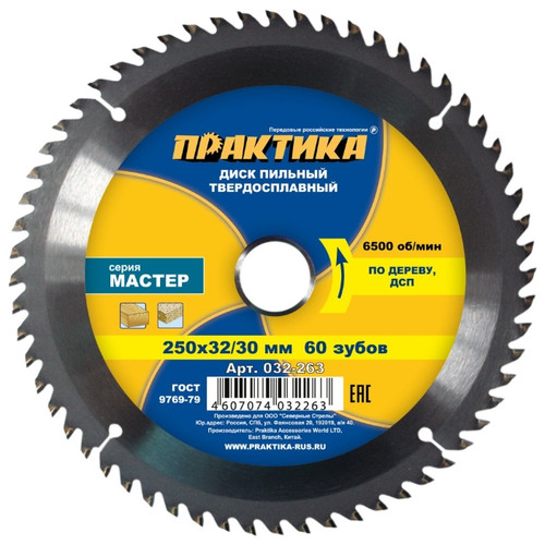 Диск пильный 250*32/30 мм 60 зубьев по дереву, ДСП "Практика"