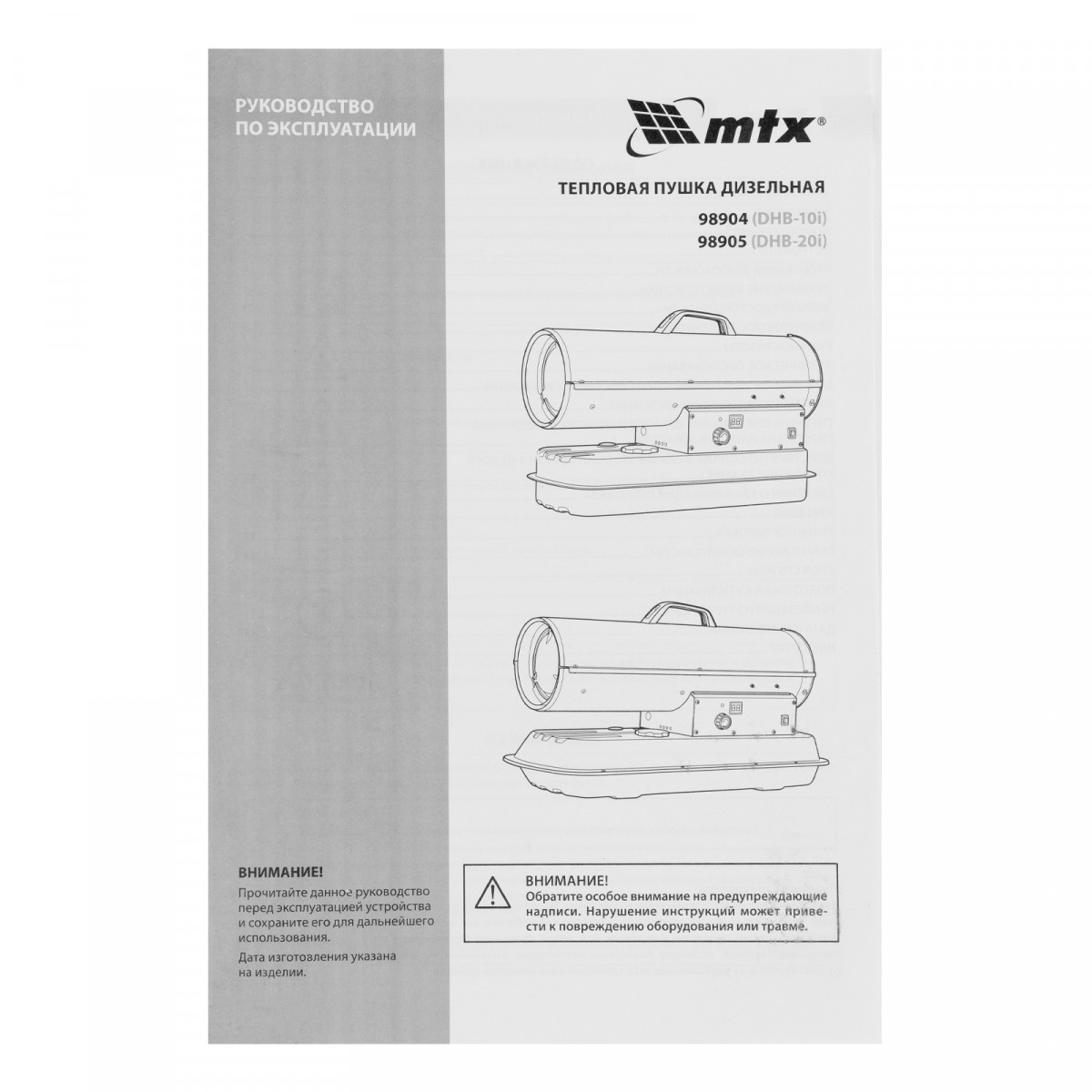 Дизельная тепловая пушка MTX DHB-10i 98904 тепловой мощностью 10 кВт и производительностью 400 м3/ч, с прямым типом нагрева и термостатом, предназначена для обогрева складов, цехов, теплиц и других нежилых помещений. Также используется на производстве и в строительстве: для прогрева бетона, просушки стен и разморозки траншей.