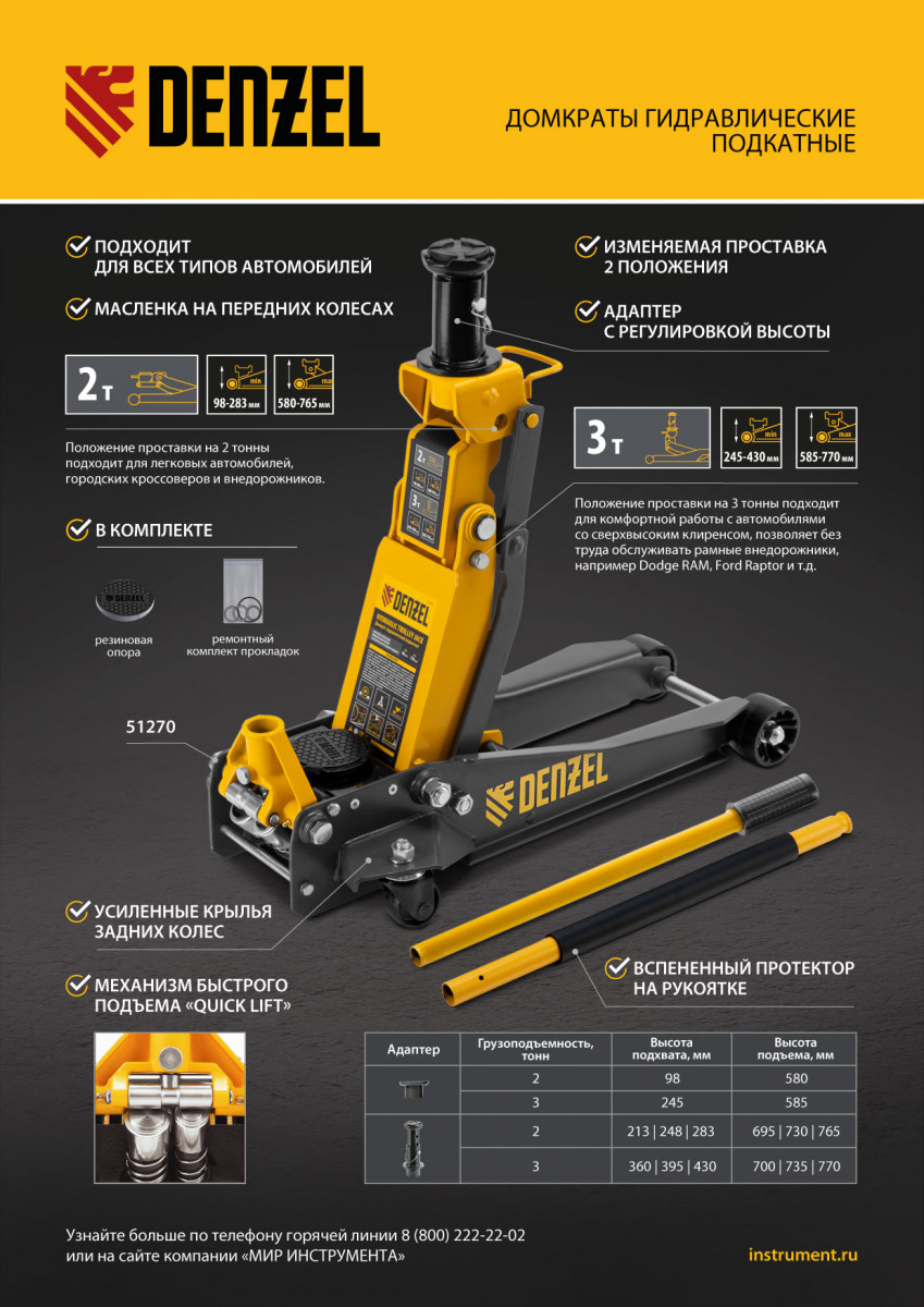 Профессиональный подкатной гидравлический домкрат Denzel 51270 с низким подхватом используется для быстрого подъема на высоту 98-770 мм всех типов автомобилей с любым клиренсом и массой до 2-3 т, в том числе SUV (внедорожников). Регулируемая проставка позволяет менять высоту подхвата и подъема, а также максимальную грузоподъемность. Высота подъема до 770 мм позволяет без труда обслуживать автомобили с высоким клиренсом, такие как рамные внедорожники, например, Dodge RAM, Ford Raptor и т.д.