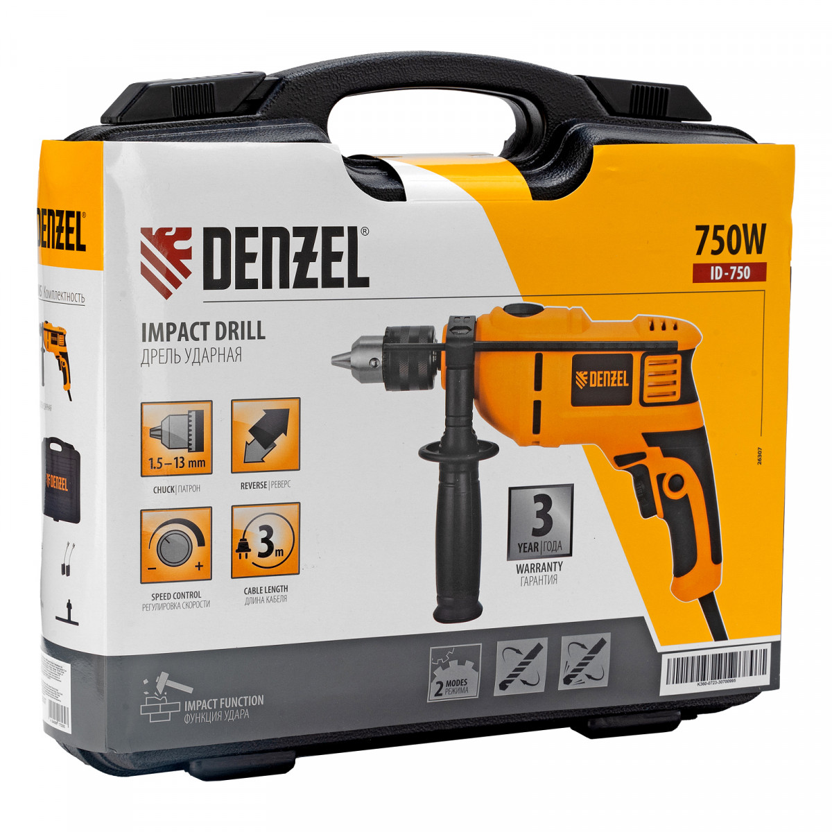 Дрель ударная ID-750, 750 Вт, 0-3000 об/мин, 48000 уд/мин Denzel