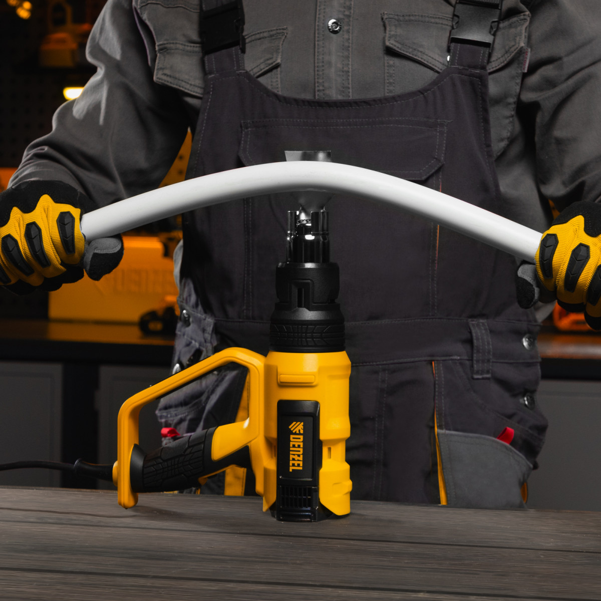 Фен технический Denzel HG-2000M 28005 мощностью 2000 Вт, с 3 режимами работы, подходит для снятия лака и краски с различных поверхностей, размораживания и пайки труб, создания изгиба в пластиковых деталях, генерации точечного теплового потока для нагрева небольших участков и др. Справиться с этими задачами помогает треугольный скребок и 4 насадки: плоская, полукруглая, отражающая и редукционная.,Мощность фена 2 кВт обеспечивает стабильную производительность на уровне 250/500 л/мин, в зависимости от выбранного режима. Температура выходящего потока составляет 50/50-450/50-600 ℃.