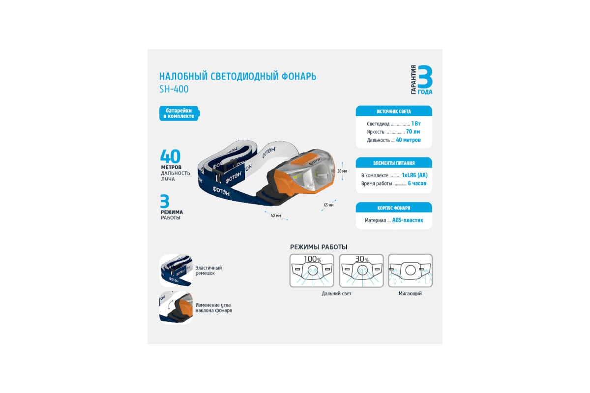 Фонарь налобный светодиодный ФОТОН 23062 SH-400 1xLR6 в комплектеШироко применяется электриками, спортсменами, туристами - то есть тогда, когда нужен яркий свет и обе руки должны быть свободны.Технические характеристики:– Материал корпуса: ABS-пластик;
