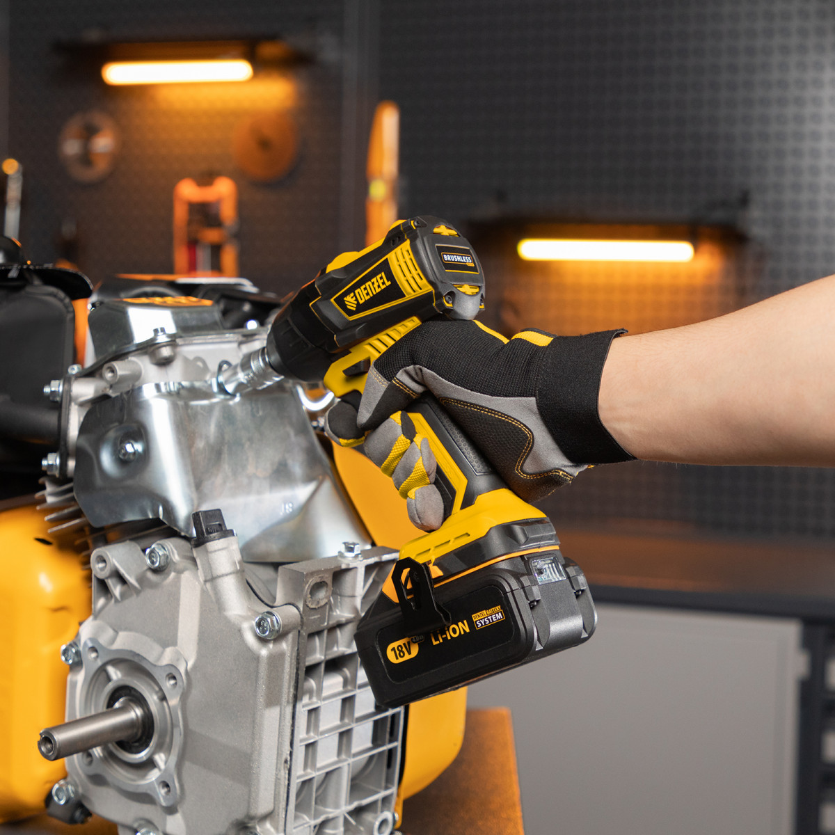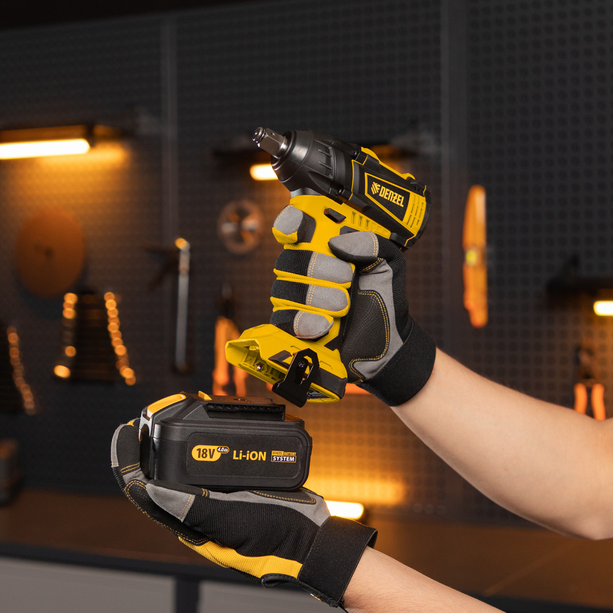- Универсальность — к инструменту подойдут любые 18 В аккумуляторы Denzel battery system.