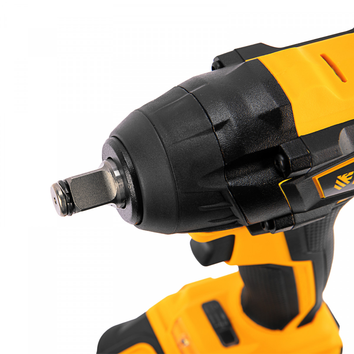 - Полная готовность к работе — в комплект входит зарядное устройство, аккумулятор, адаптер HEX 1/4 дюйма и 4 ударные торцевые головки размером 17, 19, 21 и 22 мм.