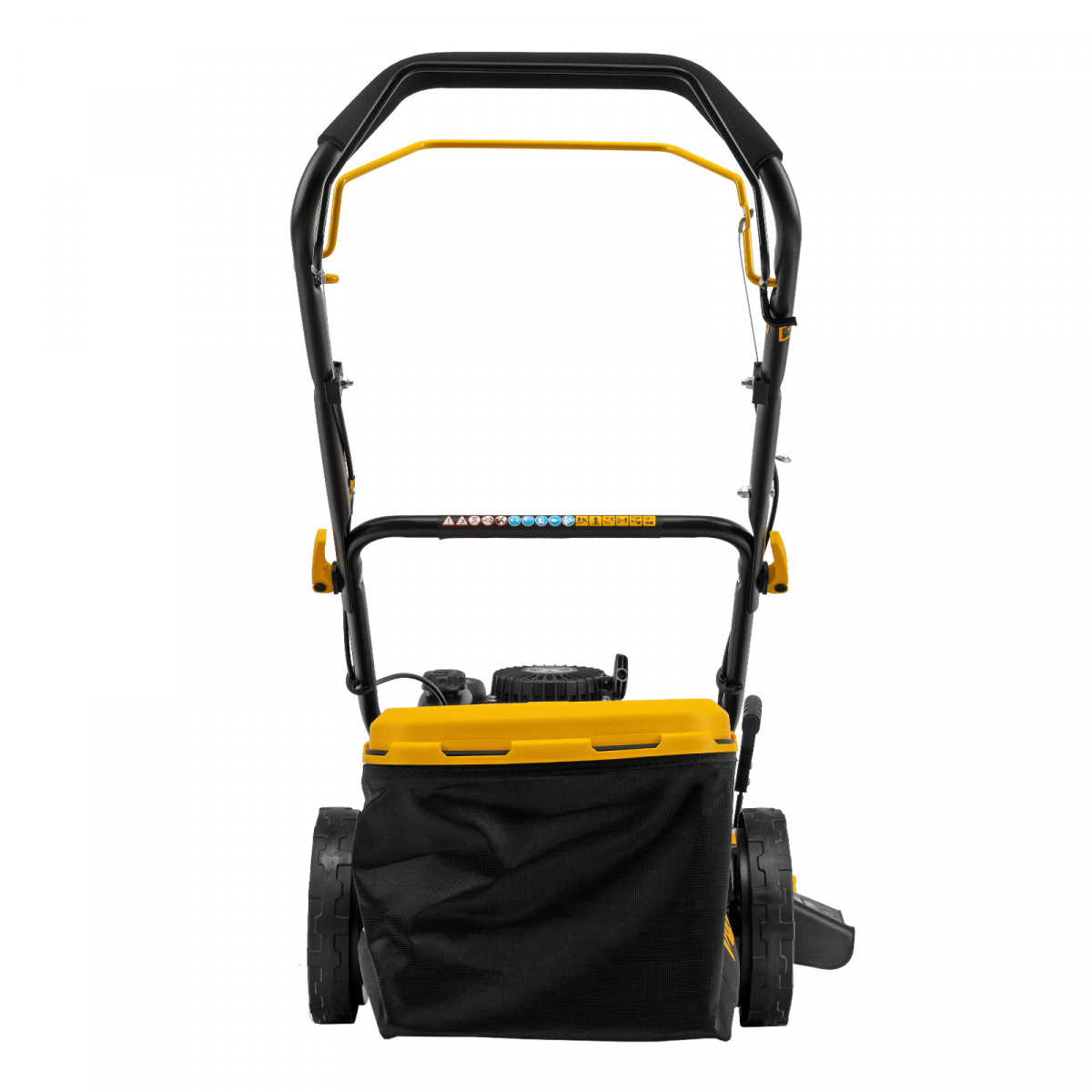 - Широкие колеса Eco-friendly — газонокосилка легко проходит по газону, не повреждая его.