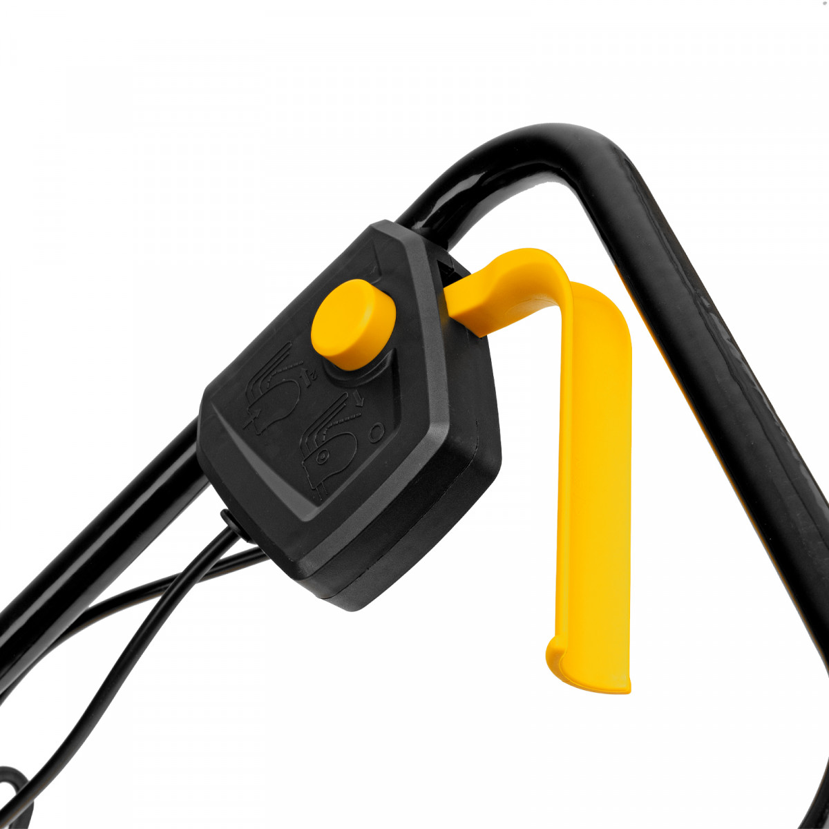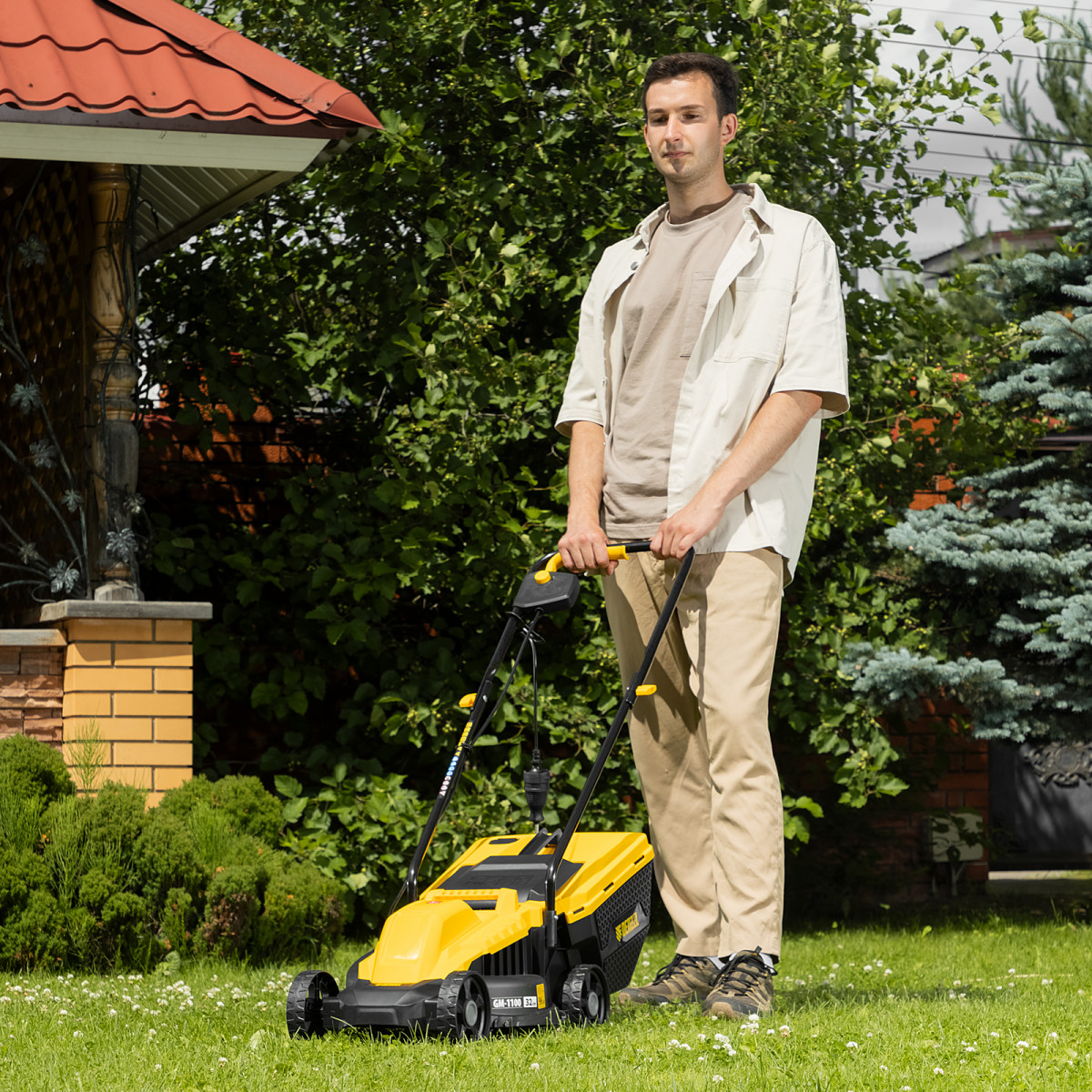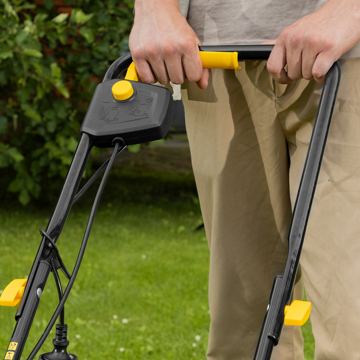 • Безопасность — функция блокировки исключает случайный запуск двигателя, а держатель кабеля предотвращает отключение техники от сети и уменьшает риск попадания провода под нож.