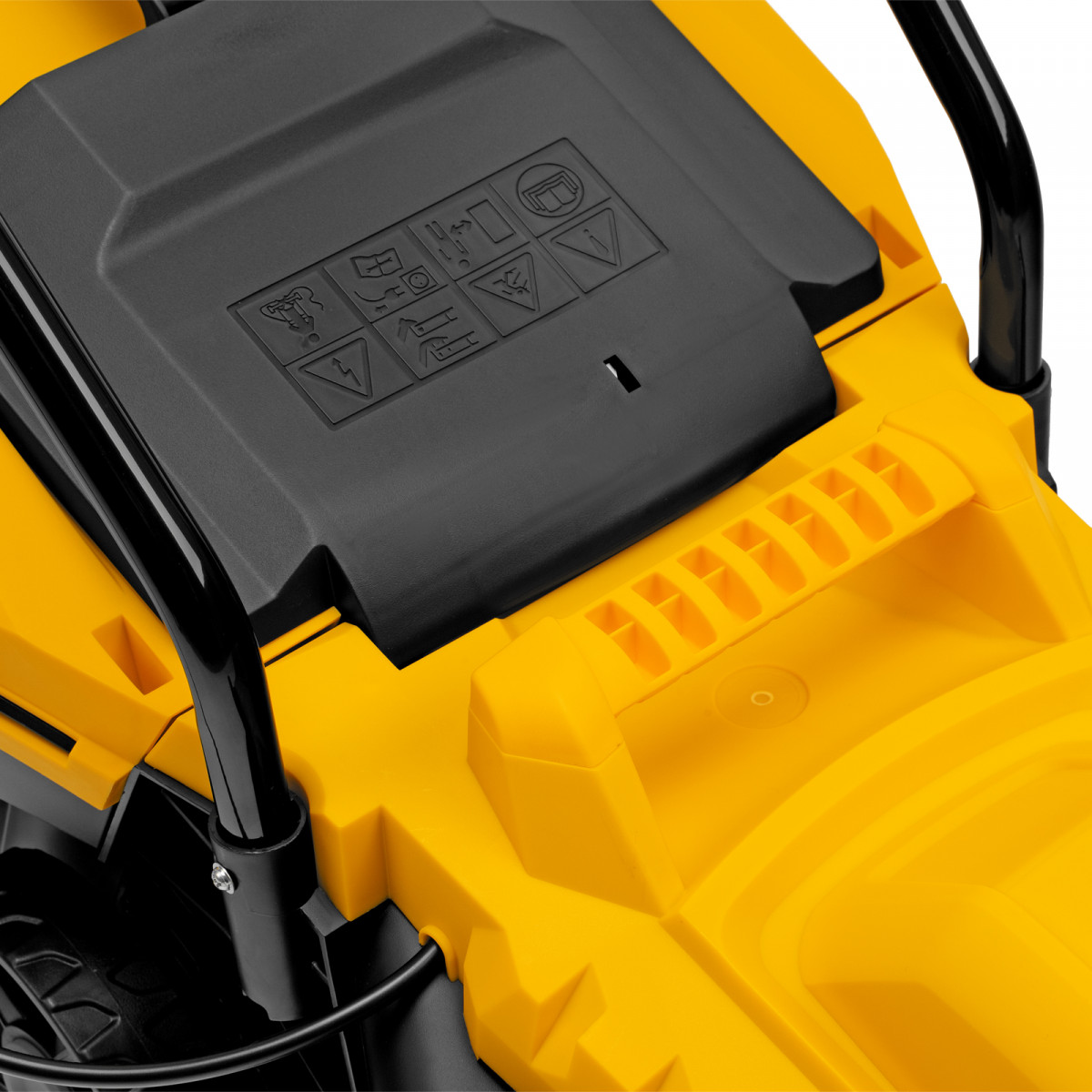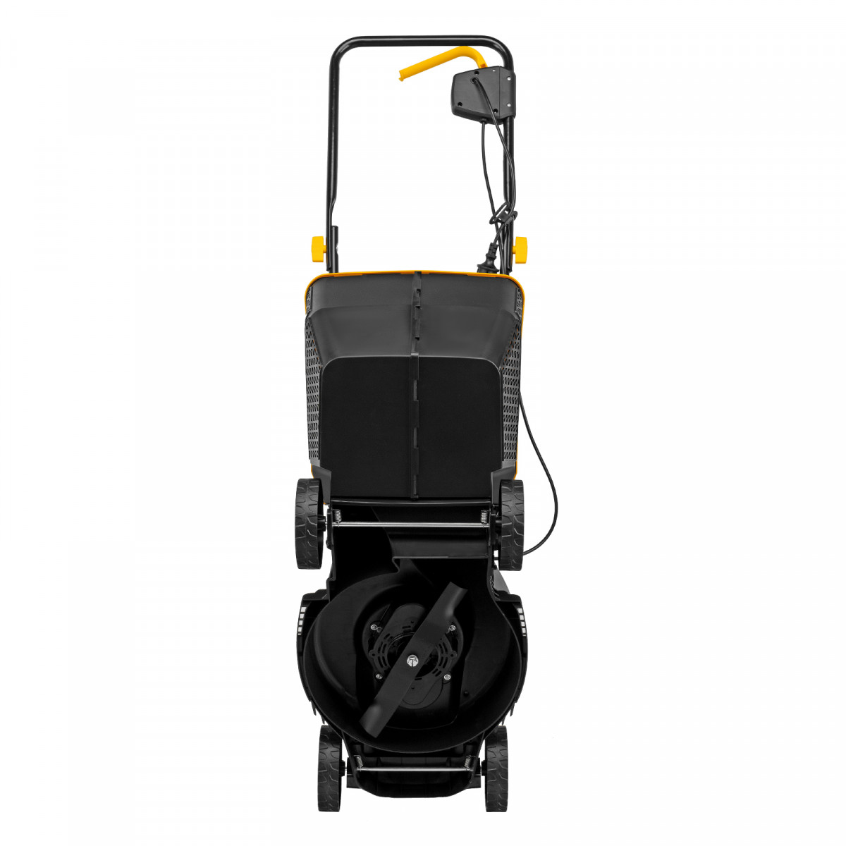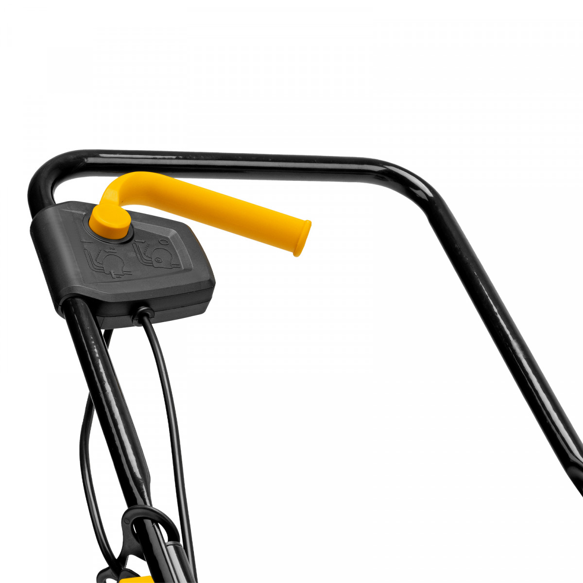 • Безопасность — функция блокировки исключает случайный запуск двигателя, а держатель кабеля предотвращает отключение техники от сети и уменьшает риск попадания провода под нож.