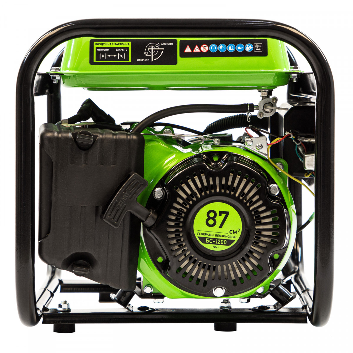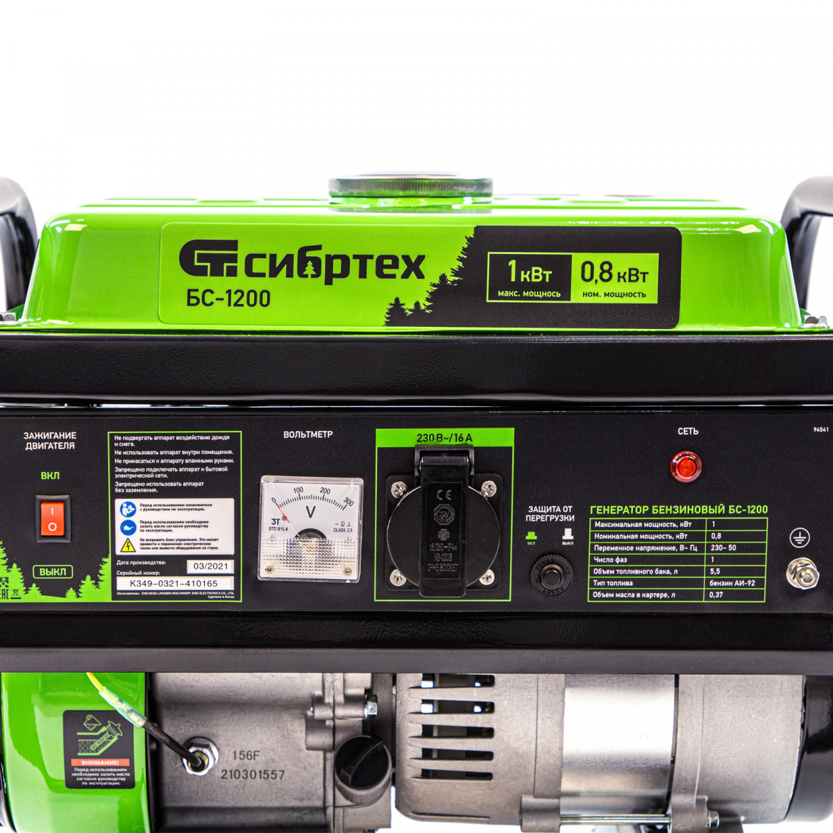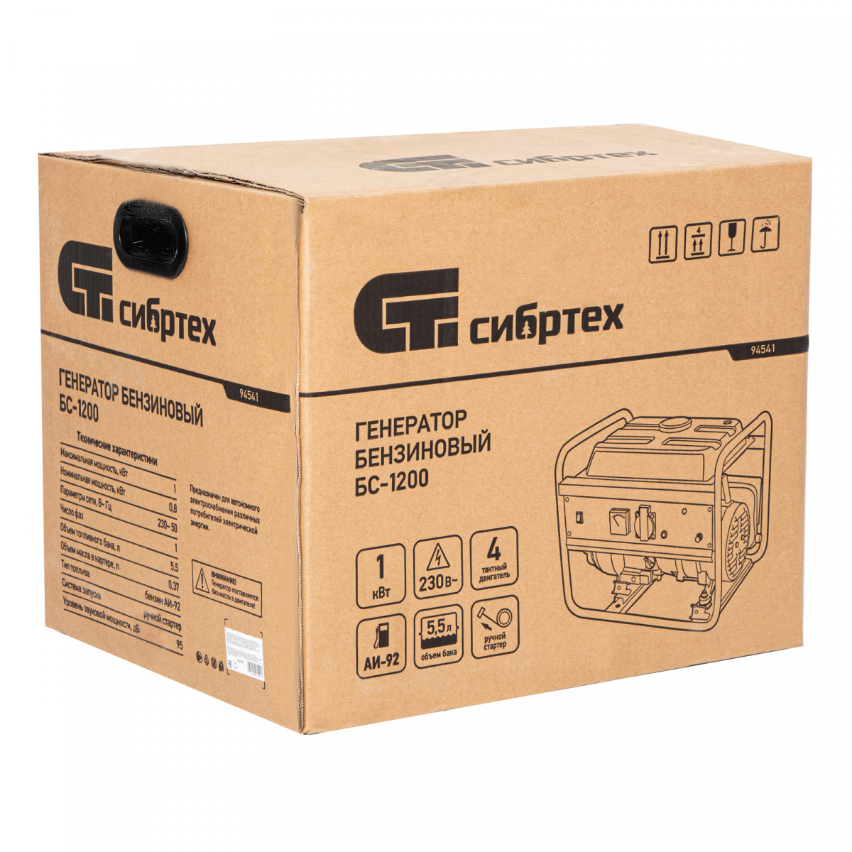 Бензиновый генератор Сибртех БС-1200 94541 на 230 В, максимальной мощностью 1 кВт, с 4-тактным двигателем, с баком на 5,5 л и ручным стартером, может использоваться в качестве простой резервной системы электроснабжения на природе, в мастерской или на даче. Вырабатываемой мощности в 800 Вт хватит для одновременного обеспечения электричеством 4 ламп накаливания, компьютера и роутера. Также возможно подключение одного инструмента с высоким пусковым током (не превышающим 1000 Вт), такого как дрель, перфоратор, углошлифовальная машина.