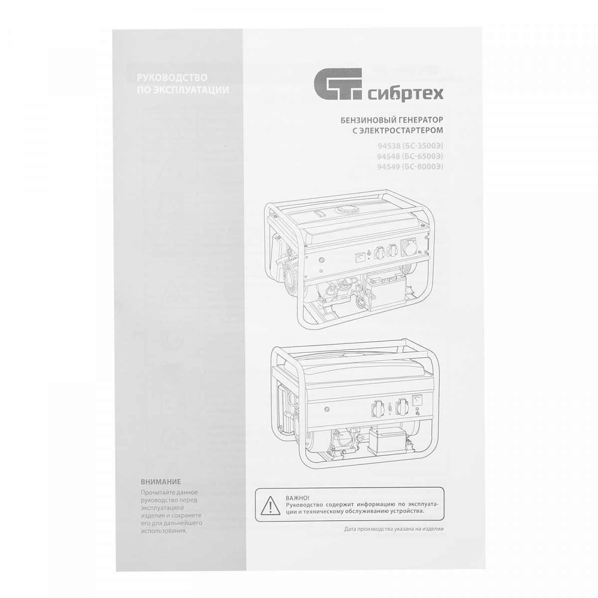 Генератор бензиновый БС-8000Э, 6,6 кВт, 230В, четырехтактный, 25 л, электростартер Сибртех