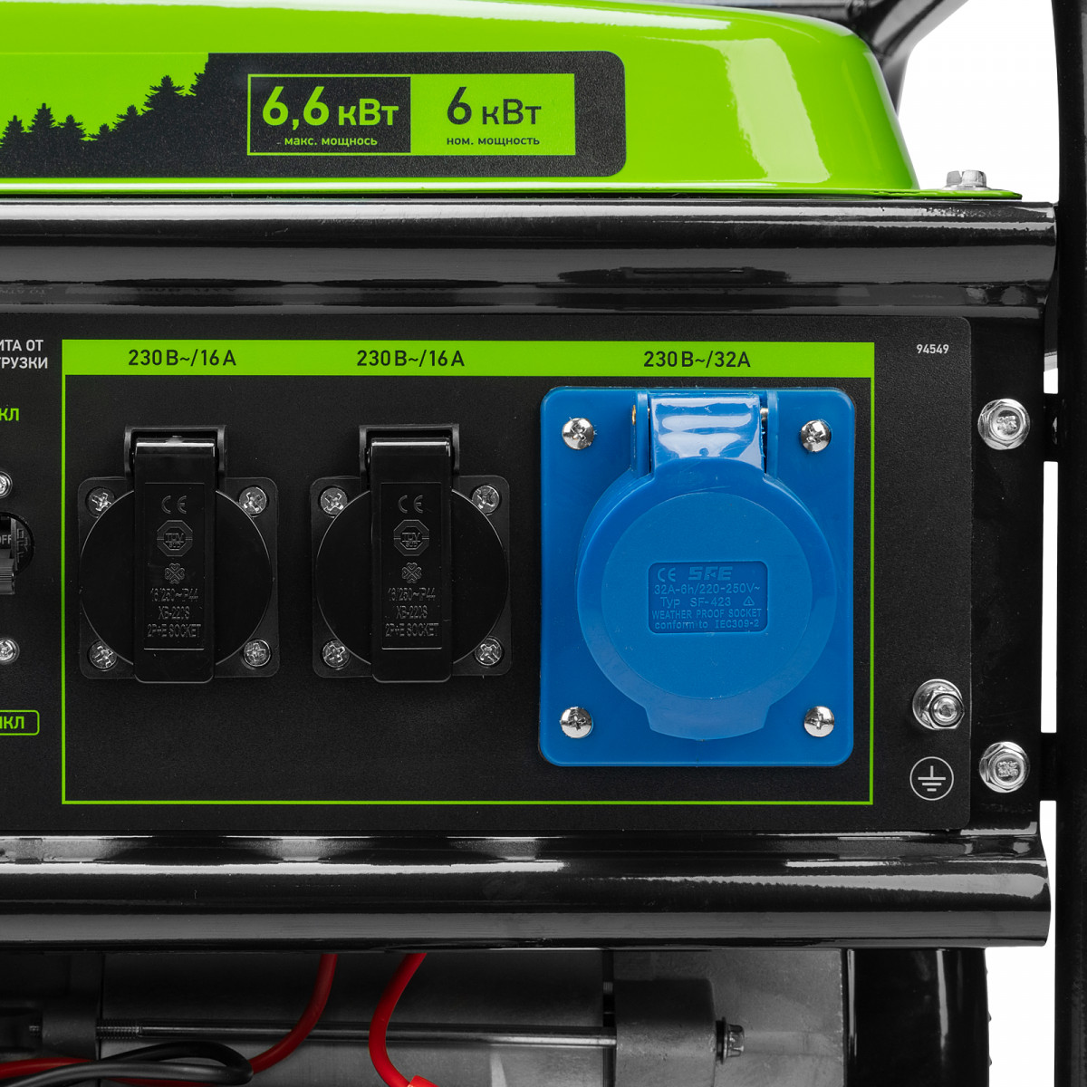Бензиновый генератор Сибртех БС-8000Э 94549 мощностью 6,6 кВт, с 4-тактным двигателем, электростартером и баком объемом 25 л, выдает напряжение 230 В и является самым производительным в линейке. Подойдет для дачи, строительной площадки, мастерской, гаража или магазина. Благодаря мощности 6,6 кВт и наличию силовой розетки способен обеспечить бесперебойную работу нескольких потребителей одновременно, например, электрической плиты, холодильника, 5 ламп накаливания. Электростартер облегчает запуск — для начала работы достаточно просто повернуть ключ.