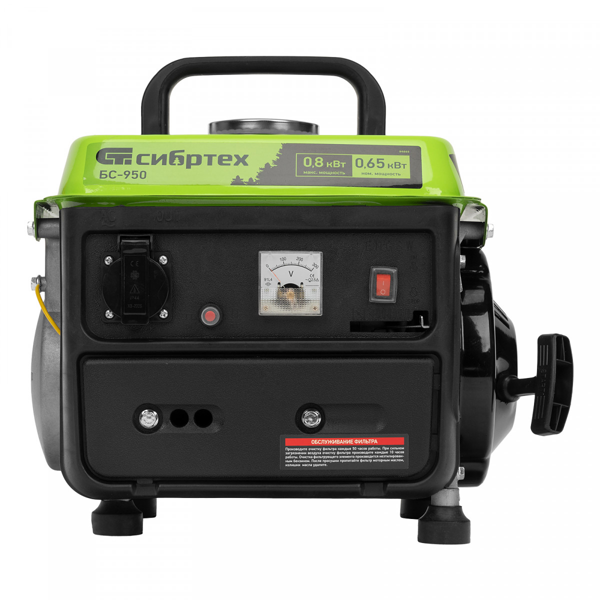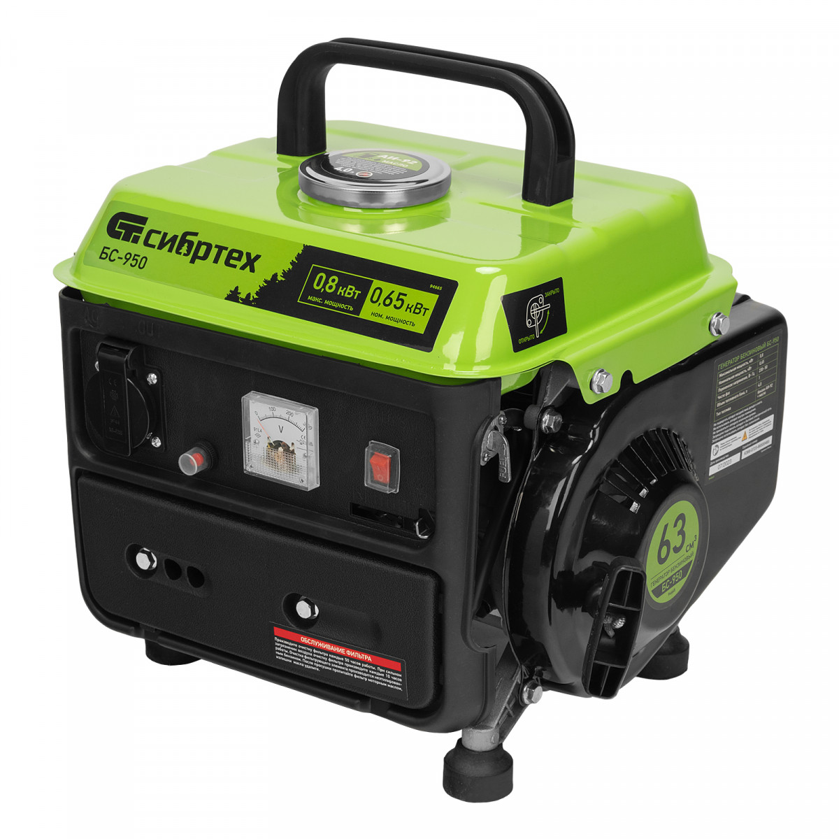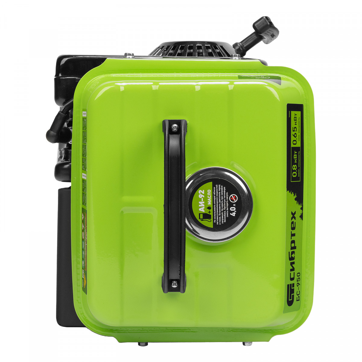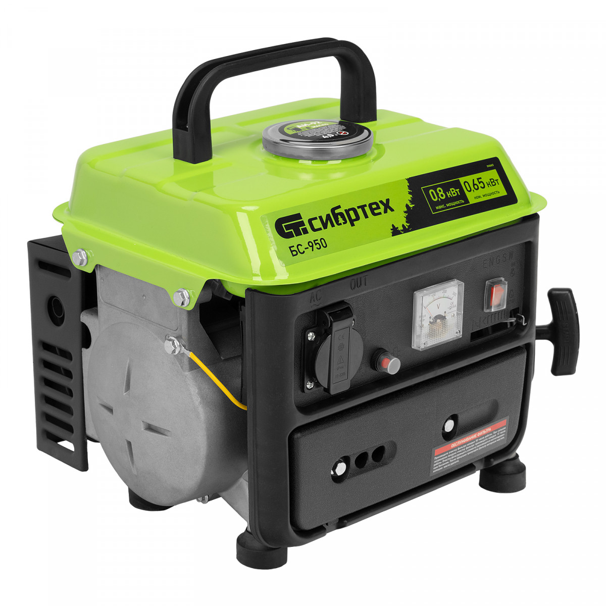 Бензиновый генератор Сибртех БС-950 94665 на 230 В, мощностью 0,8 кВТ, с 2-тактным двигателем и ручным стартером, с баком объемом 4 л, отличается небольшими габаритами, что делает его незаменимым на природе, на рыбалке, на даче или в гараже. Мощности 0,8 кВт достаточно для подключения электроинструмента или приборов с небольшим уровнем потребления энергии. На одной заправке генератор способен проработать до 4 часов.