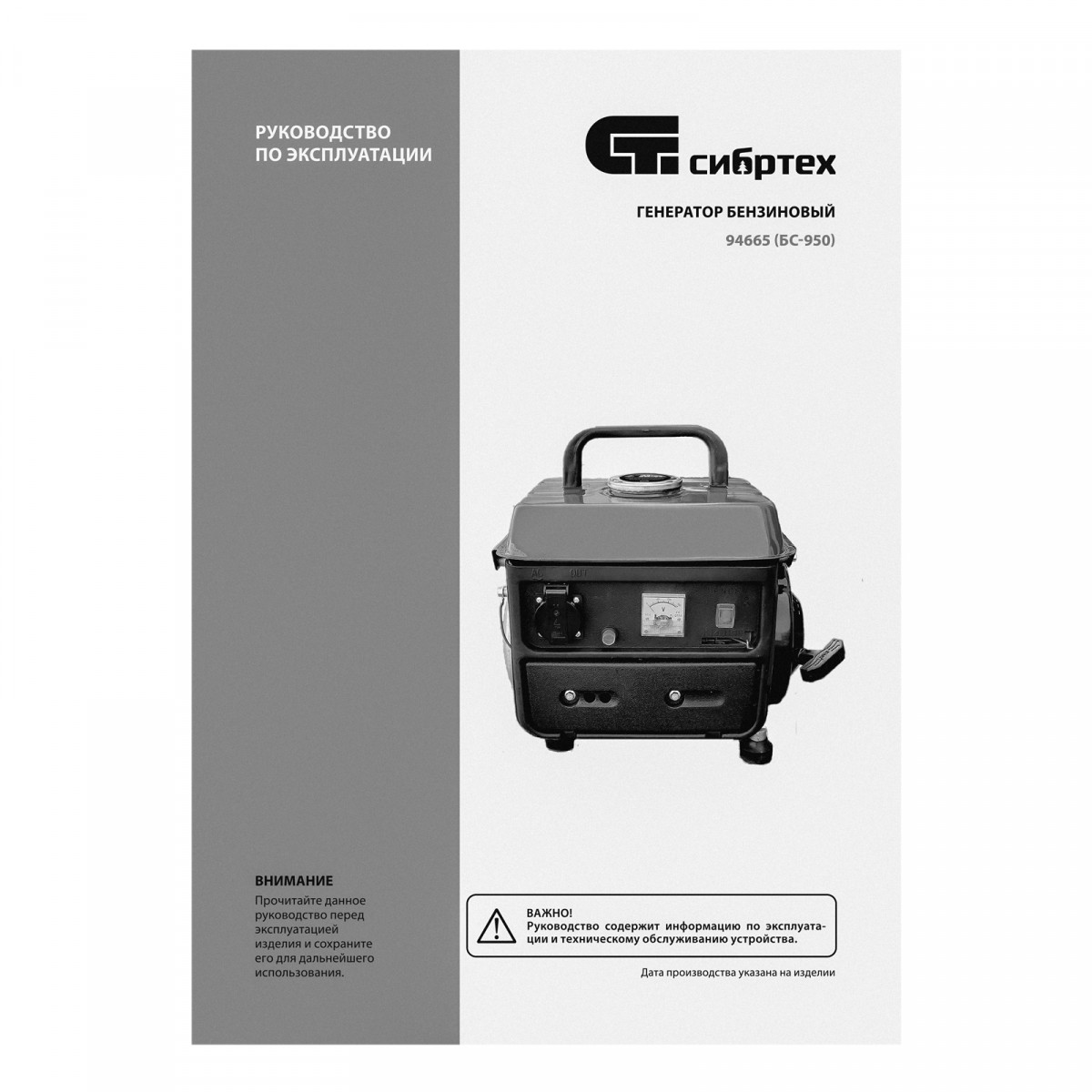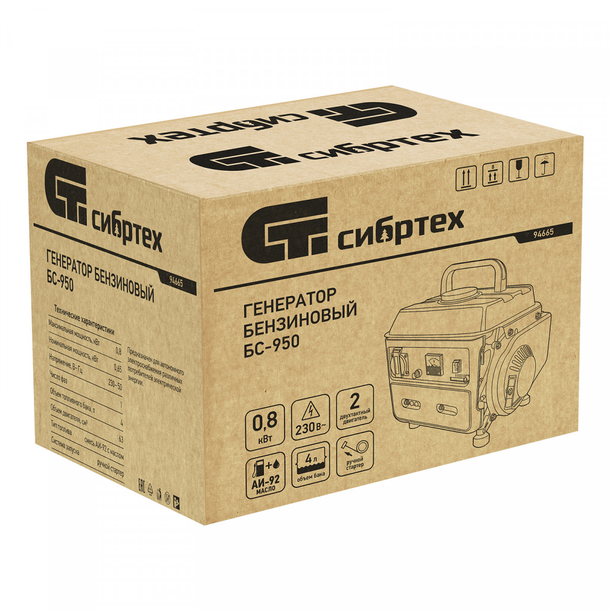 Генератор бензиновый БС-950, 0.8 кВт, 230 В, 2-х тактный, 4 л, ручной стартер Сибртех
