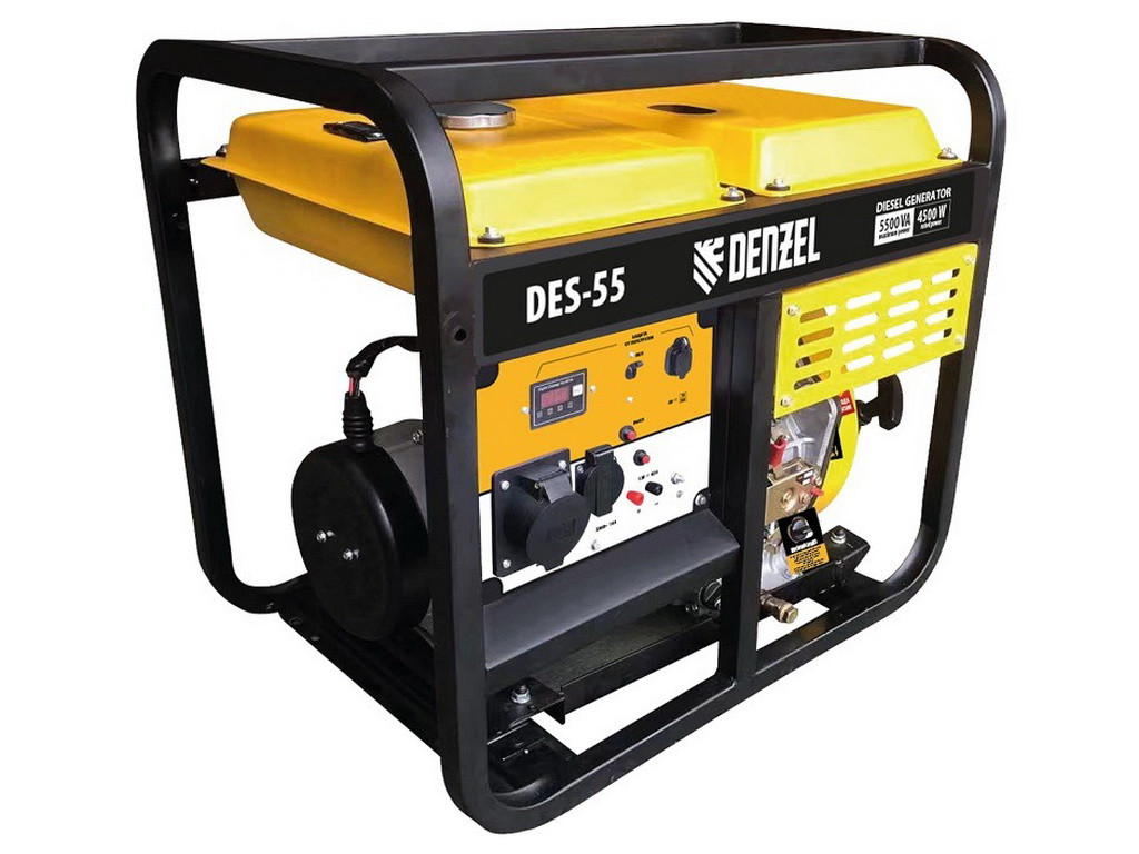 Генератор дизельный Denzel DES-55 94413 с объемом топливного бака 11 л, с ручным стартером, имеет максимальную выходную мощность 5,5 кВт и поддерживает напряжение в сети 230 В. Используется для снабжения энергией потребителей однофазного тока (осветительных приборов, бытовой техники, электроинструмента) при отсутствии доступа к стационарному источнику питания. Для подключения электроприборов служат 2 розетки: 230 В/16 А и 230 В/32 А. Клеммы постоянного тока 12 В позволяют заряжать автомобильные аккумуляторы, а двойной выход USB 5 В предназначен для подключения мобильных устройств (планшетов, смартфонов и т. д.). Генератор пригодится на строительной площадке и в загородном доме.