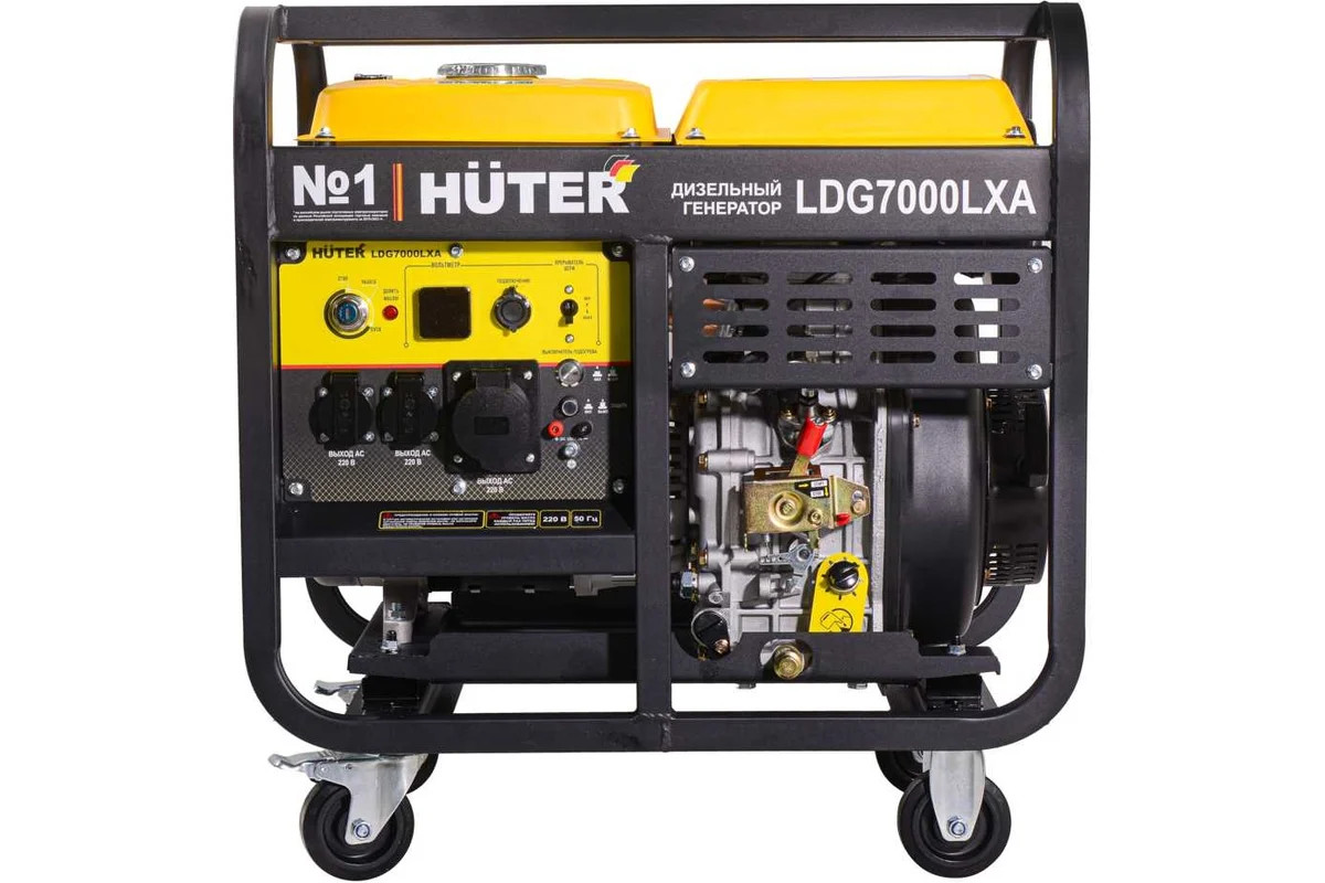 Дизельный генератор данной модели относится к переносным электростанциям, но его вес составляет 114,8 кг. Комплектуется комплектом колес для удобства перемещения. Запускается от ручного и электростартера, работающего от аккумулятора 12 В. Емкость для смазочной жидкости вмещает 1700 мл. Благодаря этому, генератор Huter LDG 7000LXА может работать длительное время без дозаправки.