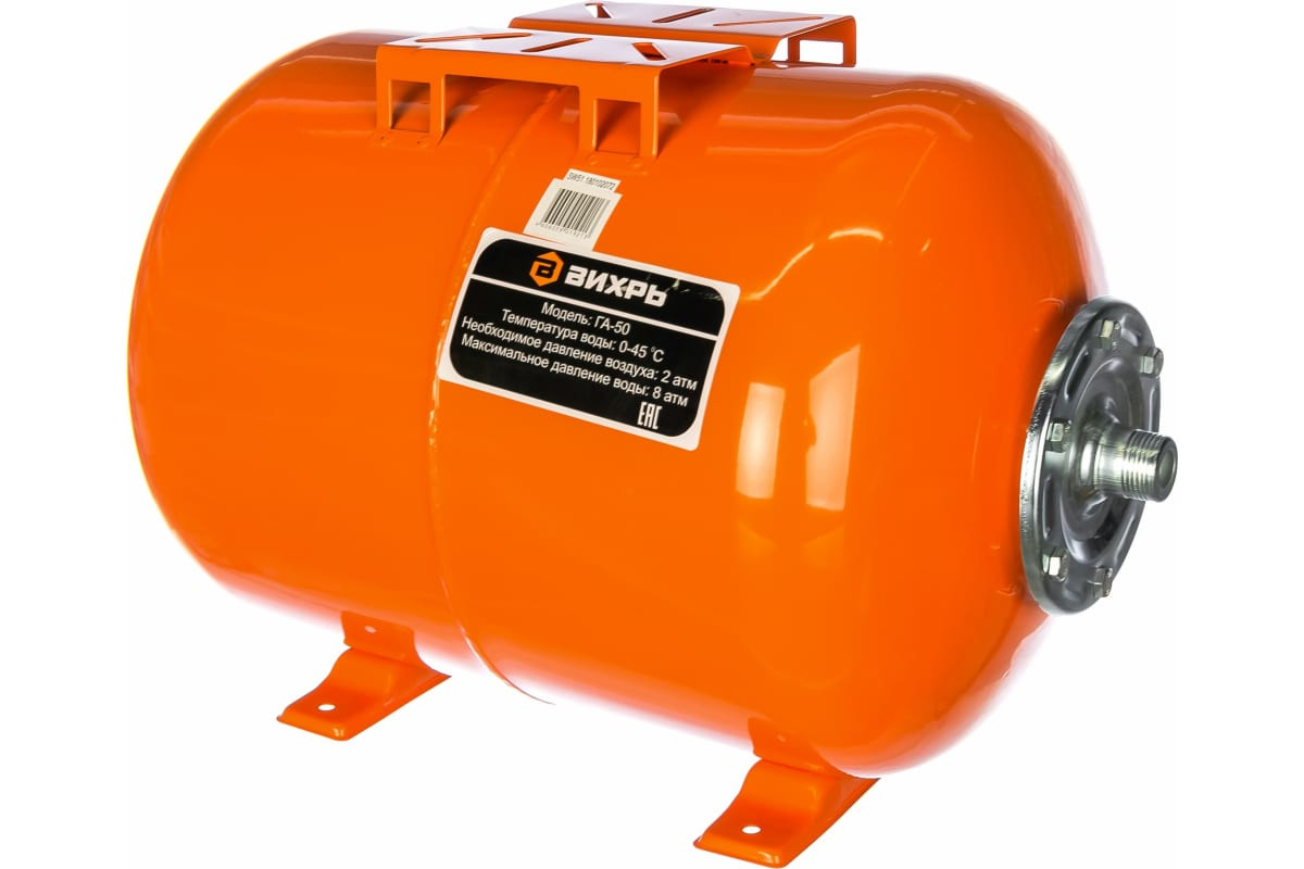 Гидроаккумулятор ГА-50 Вихрь 68/6/2 рекомендуется использовать со скважинными (до 1 кВт) или поверхностными насосами мощностью более 1 кВт. Гидроаккумулятор выступает в роли накопителя воды, а также отвечает за поддержание нужного давления воды и компенсирует его перепады в системе водоснабжения. Если такой прибор установлен, то насос включается не каждый раз при открытии крана, что значительно повышает его ресурс. Корпус и фланец агрегата выполнены из стали, что обеспечивает ему надежность и защиту от коррозии, сменная мембрана - из пищевой резины. Необходимая модель гидроаккумулятора выбирается в зависимости от мощности и объема потребляемой воды насосом.