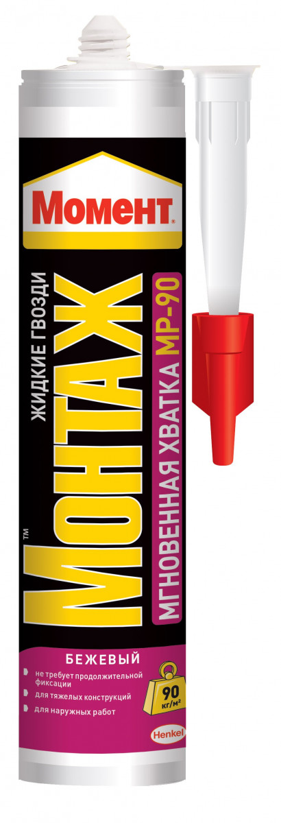 Монтажный клей Момент Монтаж Мгновенная Хватка МР-90 – Является профессиональным монтажным клеем и используется в строительстве и ремонте, при повышенных требованиях к качеству работ. Высокая первоначальная сила склеивания - 90 кг/м2 Легкий в использовании и эксплуатации Быстрое схватывание Водостойкий Обеспечивает хорошую адгезию с широким диапазоном строительных материалов. Компенсирует незначительные неровности поверхности при склеивании. Снижает звукопроницаемость. В не отверждённом состоянии легко удаляется Обеспечивает отличную адгезию с различными строительными материалами, панелями из  полистирола и стекловолокна с деревянными и металлическими стойками, дерева и других материалов, включая сухую штукатурку с виниловым покрытием, бетон и кирпичную кладку, ДВП и пробку. Клей проявляет хорошую термостойкость и рекомендуется в использовании в противопожарных стенах и перегородках. Не подходит для полиэтилена, полипропилена, тефлона, материалов разрушаемых растворителем, входящим в состав клея.