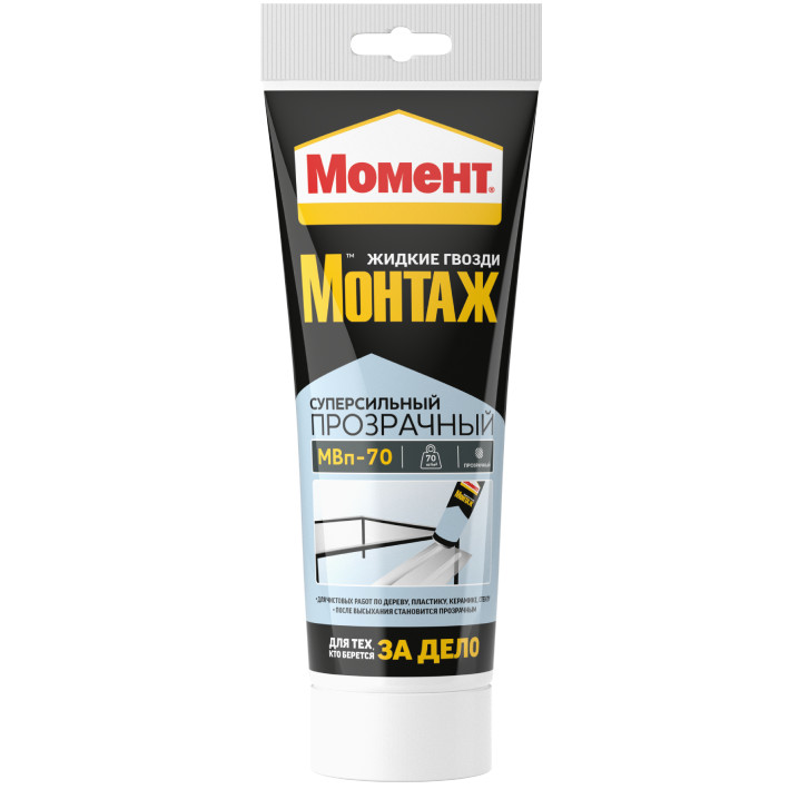 Момент Монтаж Экспресс МВп-70 является высококачественным клеем, разработанным специально для склеивания широкого спектра тяжелых конструкций внутри помещения. Преимущества: Высокая первоначальная сила схватывания – 70кг/м2. Рекомендуется для использования внутри Прозрачный Экологически чистый, без запаха. Склеивает такие материалы как стиропор, дерево, металл, ПВХ, керамику, ДСП, МДФ, гипсокартон, пробку, полистирол, пенопласт, гипс и другие подобные материалы. Используется для приклеивания: Стеновых панелей из дерева, ПВХ, пробки, гипсокартон Изоляционных панелей, декоративных деталей, профилей Установка подоконников и дверных рам Приклеивания плинтусов и декоративных фризов Не подходит для полиэтилена, полипропилена, тефлона.