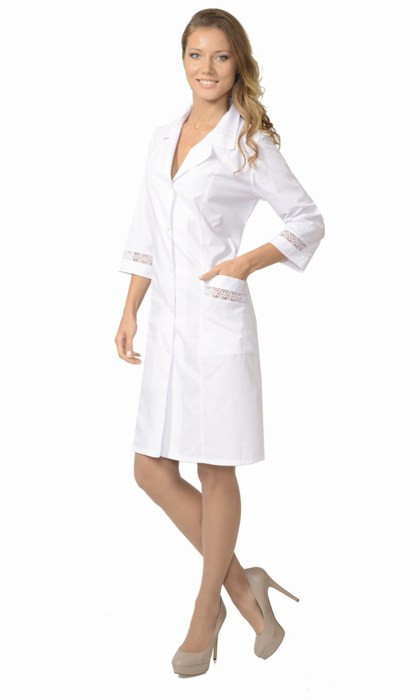 Халат полуприлегающего силуэта, с центральной застёжкой на 5 петель и пуговицы, с отложным воротником, с нижними накладными карманами с фигурными планками. Рукава 3/4. Воротник, карманы, рукава с ажурной отделкой. По талии халат регулируется поясом