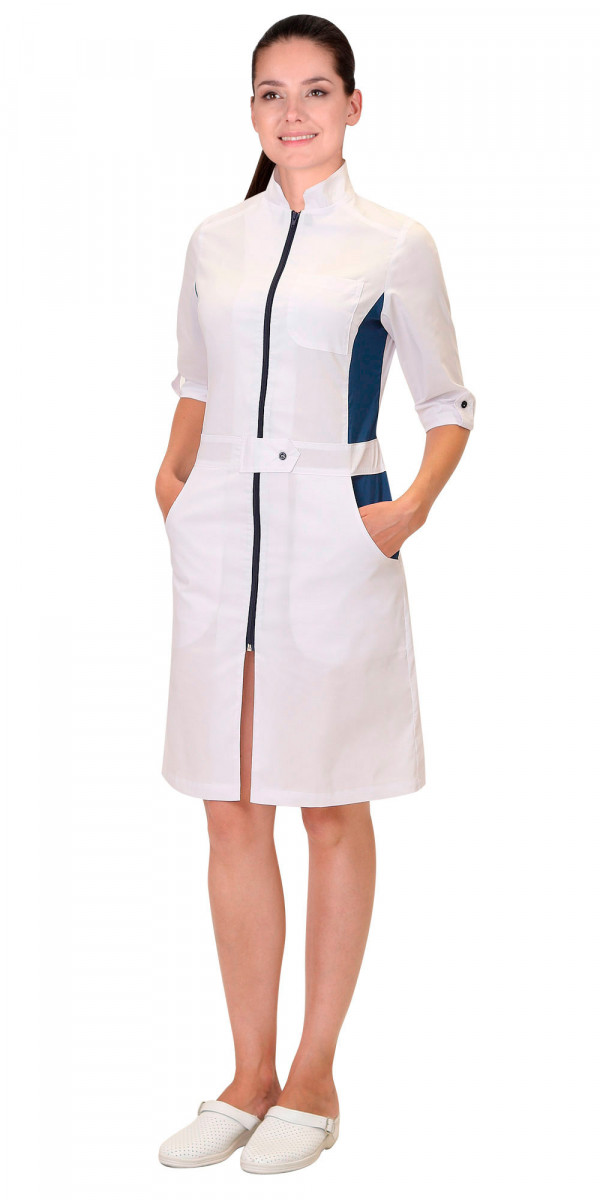 Халат полуприлегающего силуэта с центральной застёжкой на молнию. Воротник стойка. Нагрудный маленький карман для крепления бейджа и два внутренних кармана в рельефе. Рукава втачные, длиной 3/4. По линии талии втачной пояс с патой застегивающейся на пуговицу. Боковые детали халата из отделочной ткани темно-синего цвета.