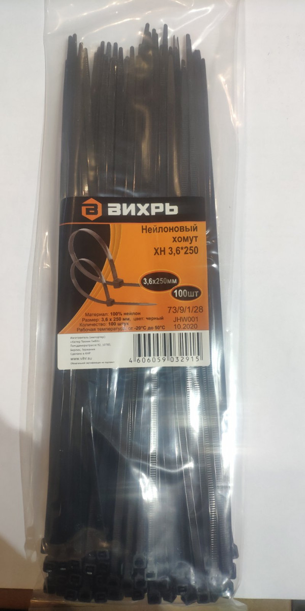 Хомут нейлоновый 3,6*250 черный (100шт) Вихрь