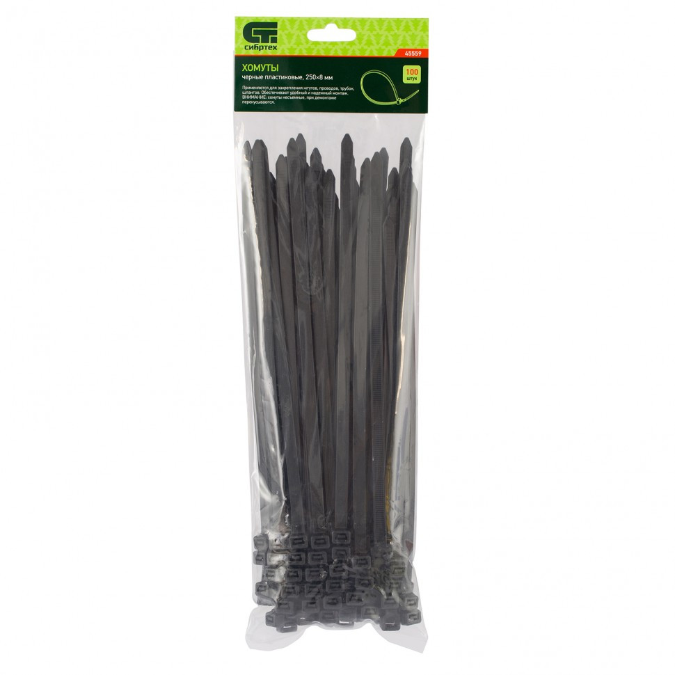 Черные пластиковые хомуты Сибртех 45559, 250 х 8 мм, 100 шт. в упаковке, используются для стяжки кабелей, закрепления трубок, шлангов, рекламных конструкций, а также для упаковки различных предметов. Пригодятся во время прокладки электрических и локальных вычислительных сетей, ремонта компьютерной техники, оформлении торговых стендов, комплектовании товара, будут также полезны дома, на даче и в гараже.