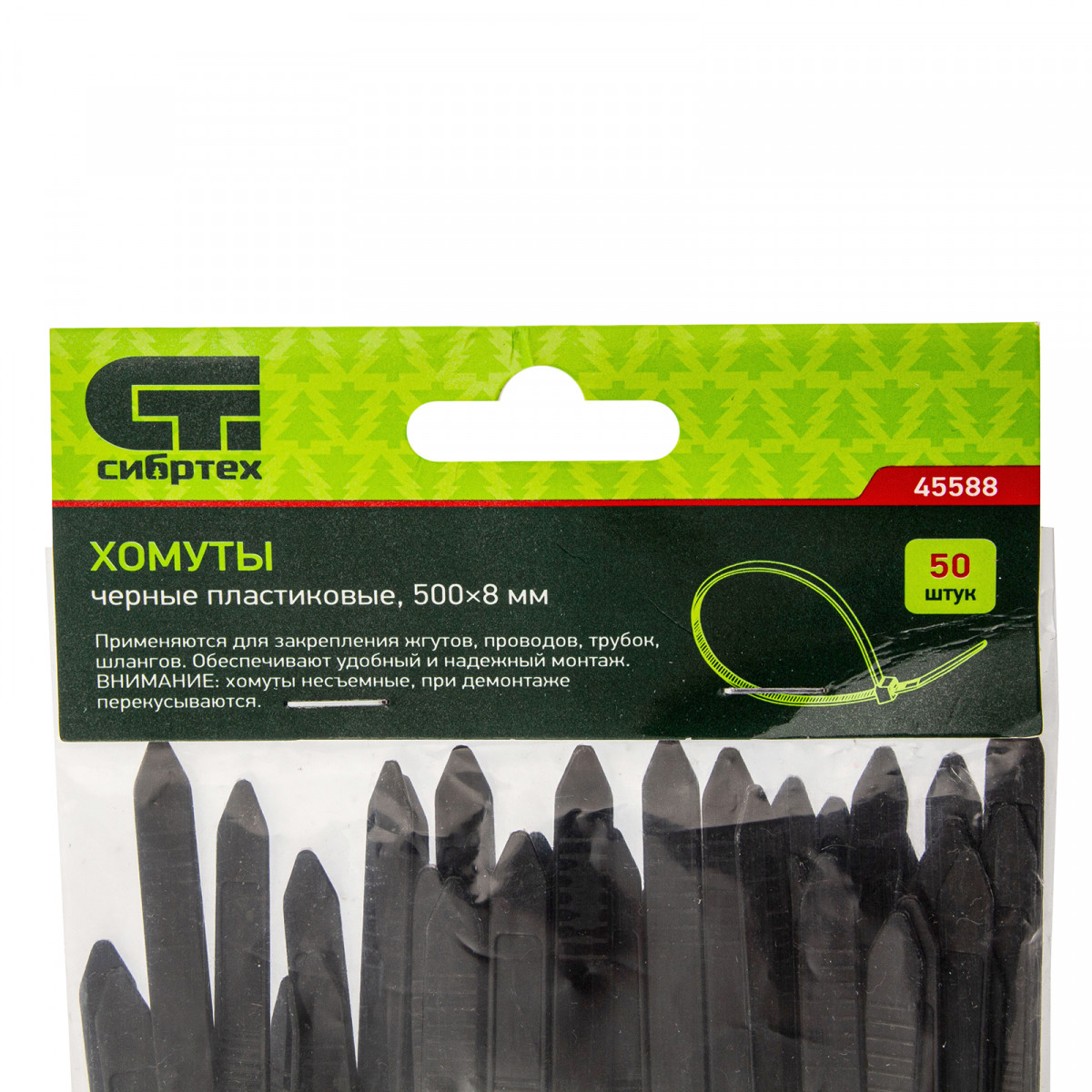 Черные пластиковые хомуты Сибртех 45588, 500 х 8 мм, 50 шт. в упаковке, используются для стяжки кабелей, закрепления трубок, шлангов, рекламных конструкций, а также для упаковки различных предметов. Пригодятся во время прокладки электрических и локальных вычислительных сетей, ремонта компьютерной техники, оформлении торговых стендов, комплектовании товара, будут также полезны дома, на даче и в гараже.