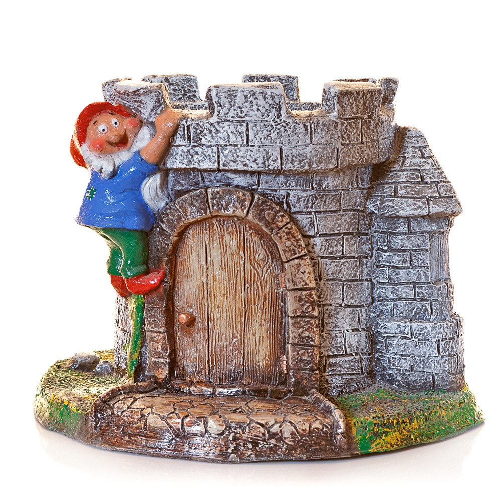 Кашпо для цветов гном с замком изготовлен из стеклопластика. Яркая покраска делает кашпо настоящей изюминкой сада. В кашпо сажают уличные цветы, которые легки в уходе. Такое кашпо можно поставить у входа в дом, рядом с беседкой или рядом с детской площадкой.