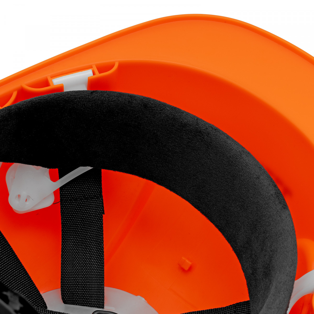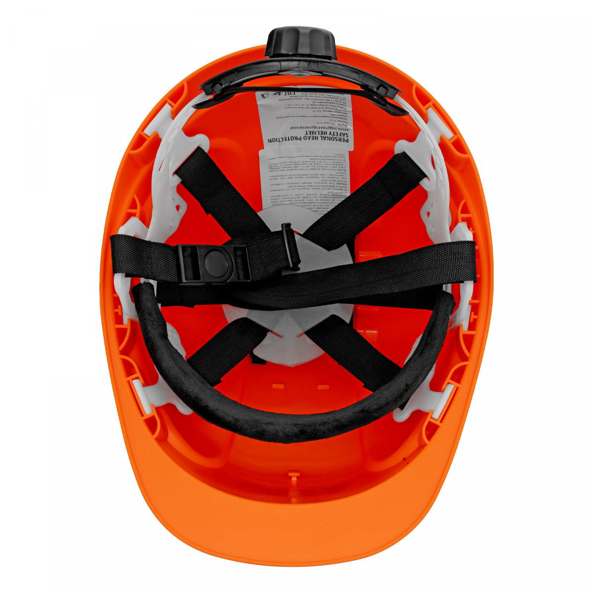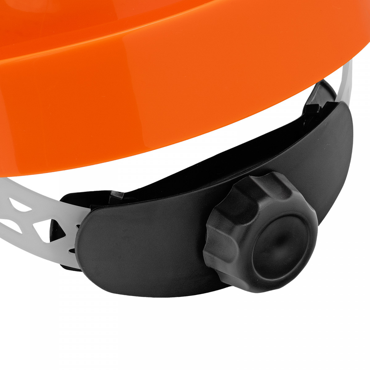 • Удобная посадка — наголовное крепление с храповиком позволяет плавно подгонять и точно регулировать размер оголовья от 52 до 62 см, каска комфортно прилегает к затылочной части головы за счет мягкой эластичной вставки.