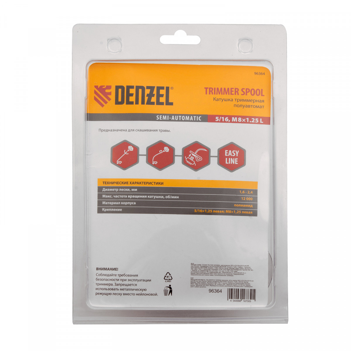 Полуавтоматическая триммерная катушка Denzel 96364 с возможностью быстрой заправки, с посадкой под шестигранник HEX x 15/6, с болтом 5/16 и М8 с левой резьбой, предназначена для установки на бензиновую или электрическую косу. Совместима с режущей леской диаметром до 2 мм и успешно справляется с молодой травой на садовом участке.