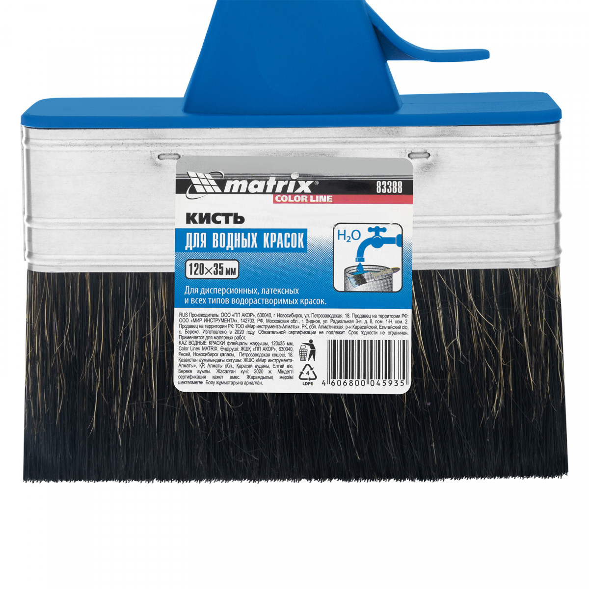 Плоская кисть Matrix Color Line «ВОДНЫЕ КРАСКИ» 83388 шириной 120 мм и толщиной 35 мм разработана специально для использования с составами на водной основе, в том числе деревообрабатывающими. Комбинированная щетина оптимальна для работы с водными лакокрасочными материалами — искусственные волокна препятствуют деформации, а натуральные удерживают большой объем краски.