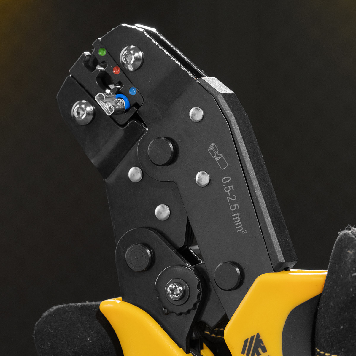 Клещи Denzel 17747 предназначены для обжима изолированных кольцевых наконечников НКИ и вилочных НВИ, разъемов плоских РПИ, гильз соединительных ГСИ сечением 0,5-2,5 мм². Инструмент пригодится частным и профессиональным мастерам при проведении электромонтажных работ.