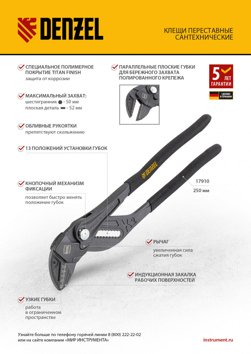 Сантехнические переставные клещи Denzel 17910 длиной 250 мм, с обливными рукоятками и кнопочным механизмом, предназначены для захвата и вращения гаек и фитингов. Максимальная ширина раскрытия губок составляет 50 мм. Губки всегда параллельны, что позволяет равномерно распределять усилие сжатия и избежать повреждения фиксируемого предмета.